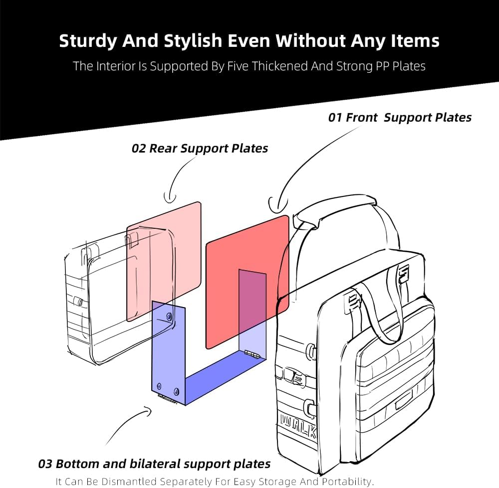 - More user-friendly designs: The interior is supported by five detachable thickened and strong PP plates, so the bag can be sturdy and stylish even without any items; Back plate use non slip and wear resistant material, fits the frame position to ensure that the paint will not be worn; Top handle for easy access to the bag; Logo reflective printing, enhanced security at night riding; Each bag is equipped with a single shoulder strap.