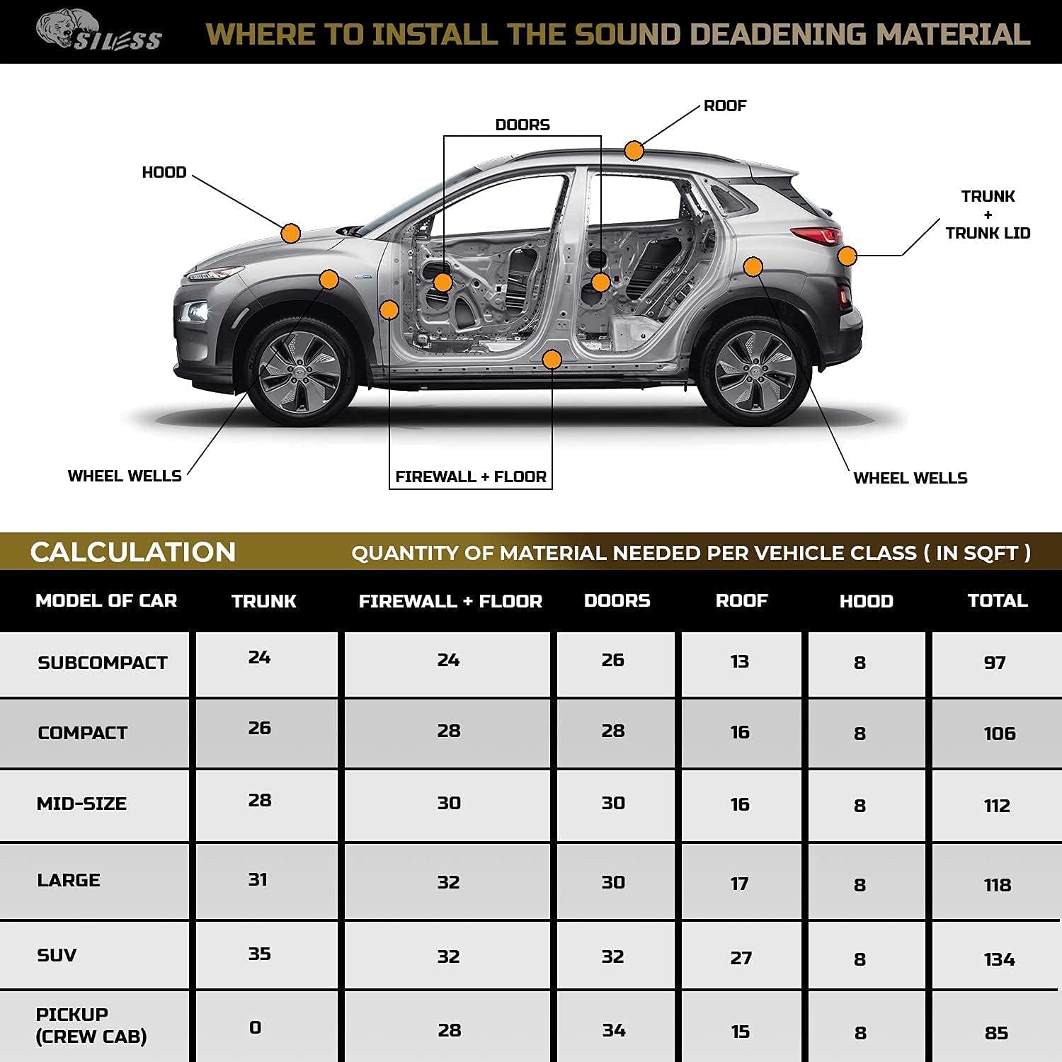 - β Value - SILESS VIBRO Damping Material is just priced to be cost effective, when compared to similar products on the market. Car soundproofing does not have to be expensive to work!!