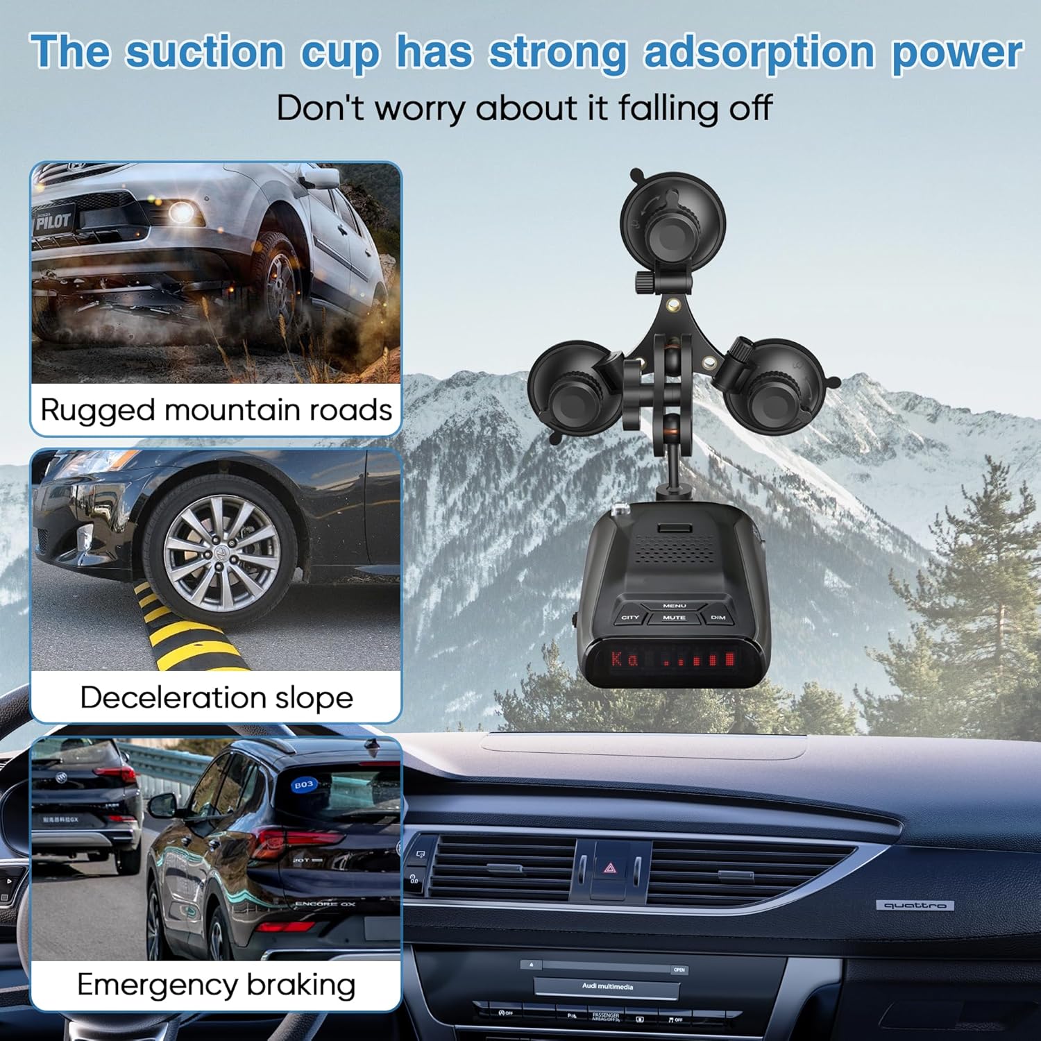 - HIGH QUALITY BRACKET Say goodbye to plastic brackets that are prone to falling off when exposed to high temperatures. Our triangular suction cup car mounted radar bracket is made of all aluminum alloy and has undergone anodizing treatment to improve corrosion resistance and wear resistance. No matter on rugged mountain roads, deceleration slopes, or sudden braking, there will be no shaking during driving, ensuring safety and stability without worrying about falling off