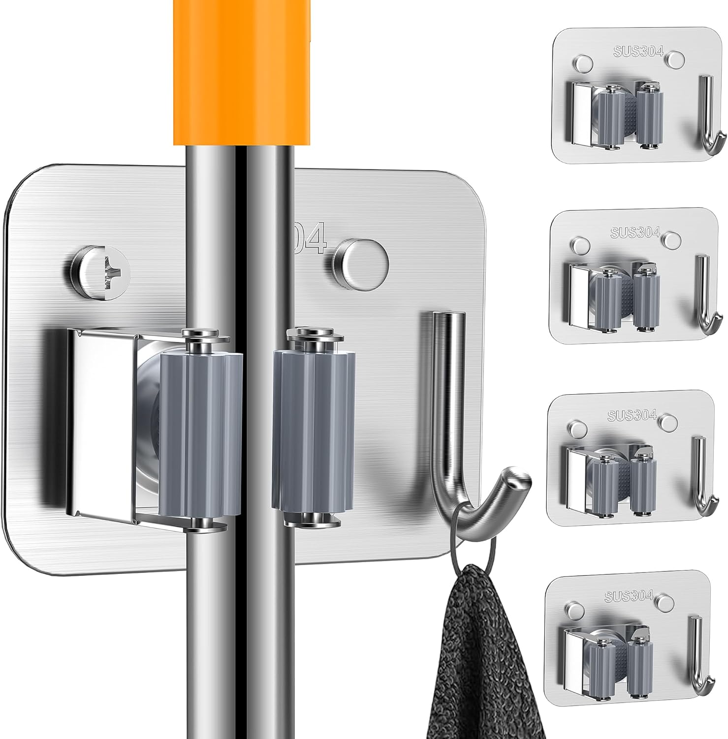 - Economical 4-Pack: This value set includes 4 broom and mop organizer wall hanging and 10 screws. Spread them across multiple rooms or create a dedicated cleaning station. The elegant silver finish complements any dΓ©cor, offering both functionality and style.