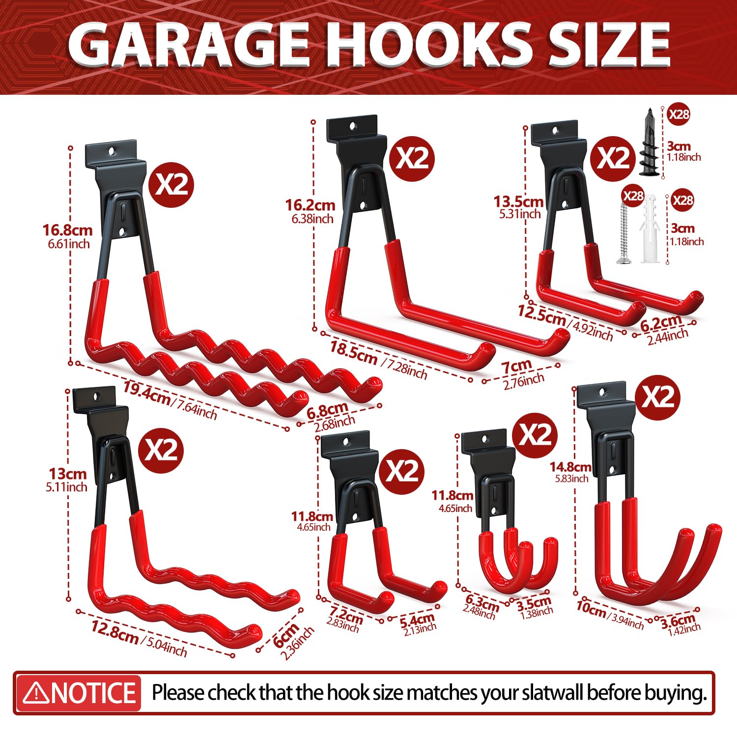 - Multi Sizes Slat Wall Hooks: 14 pcs slat wall accessories in 7 different sizes, including 2 large wave garage wall hooks, 2 media wave hooks,2 large square ladder hooks, 2 medium square hooks, 2 small square proslat hooks, 2 media J hooks and 2 small J heavy duty garage hooks which can accommodate different types of garden tools and equipments. Our ladder hooks for garage wall are designed to meet your daily needs, optimizing space