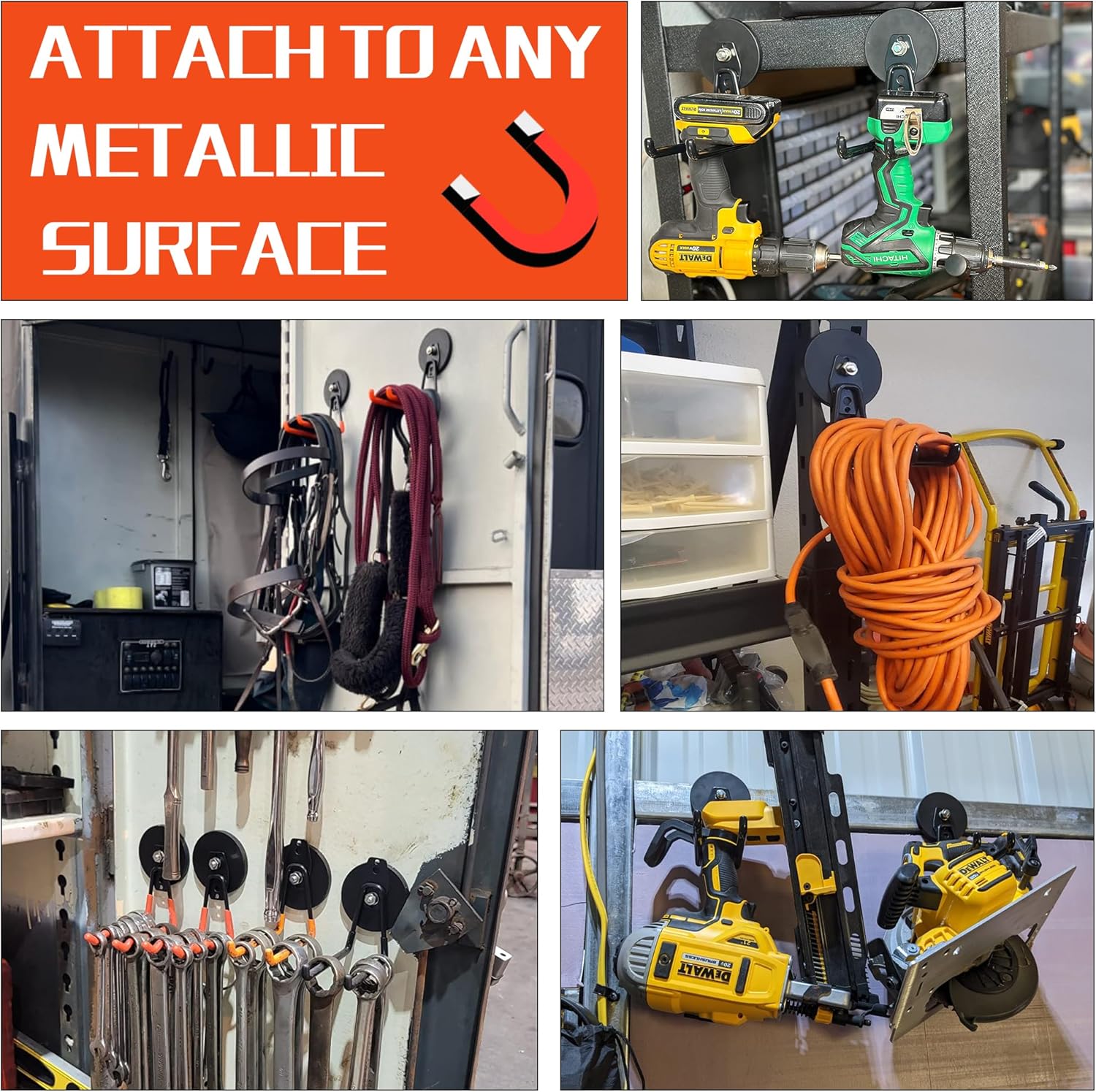 - [Heavy Duty Magnetic Hook]: Heavy duty solid steel hooks can create efficient storage space for your garage, garden, shop, basement or warehouse. For example, to store drills, garden tools, power tools, shovels, brooms, ropes, hoses, etc
