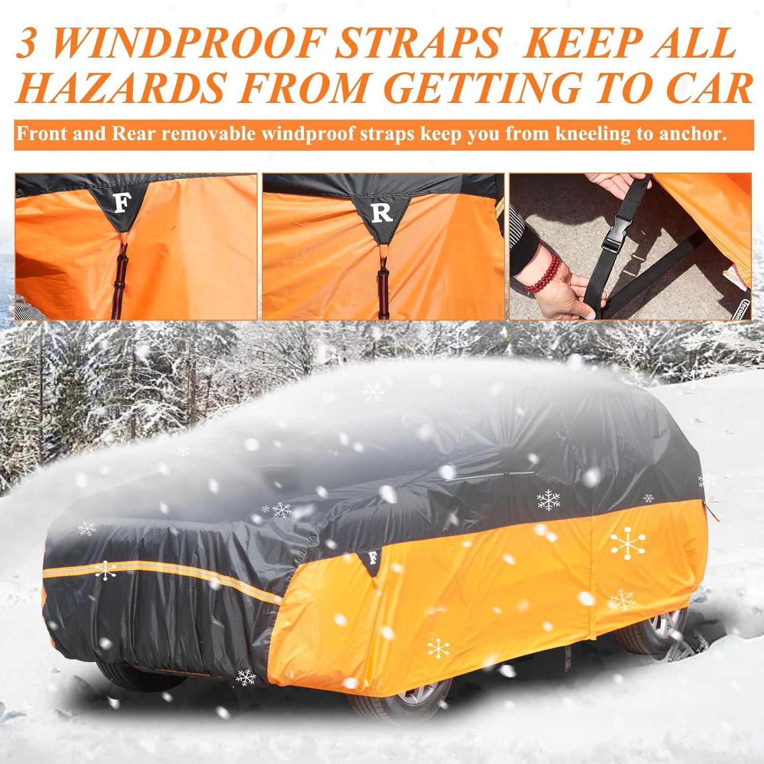 - PROFESSIONAL DESIGN - 1. 3 adjustable car cover windproof straps help to against strong wind, front & rear straps are detachble, center straps connects to the bottom of the car cover. 2. Invisible mirror pockets with waterproof zipper to make the car cover more suitable. 3. Long reflective strips on front and back, night warning to protect your car. 4. The classic driver door zipper design for easy access. 16. High Elastic hem at front and rear, make the car cover fit better