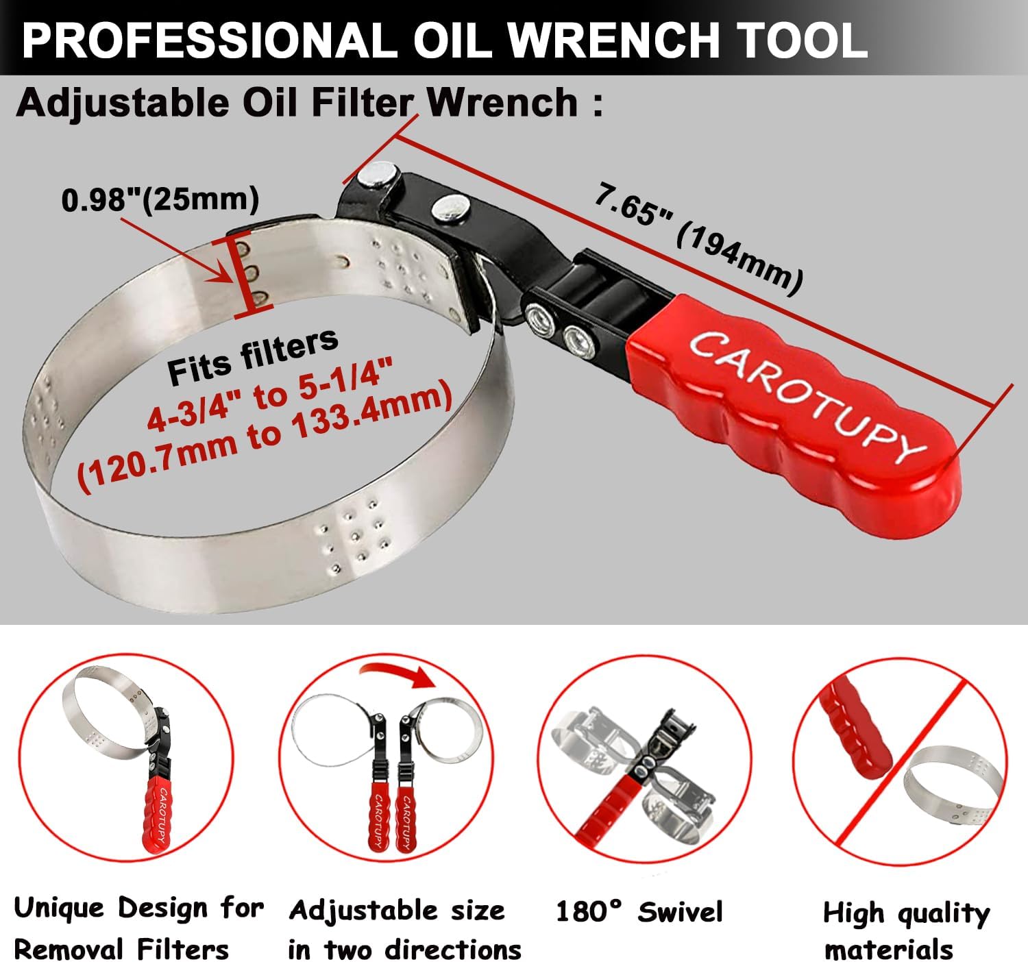 - Oil Filter Wrench Tool: The oil filter tool with a range from 4-3/4"to 5-1/4" (120.7 mm to 133.4 mm) is ideal to remove and repair oil filters easily from cars, motorcycles and trucks etc. Satisfy your daily demands and meet your work needs for maintenance of oil filters and oil change.