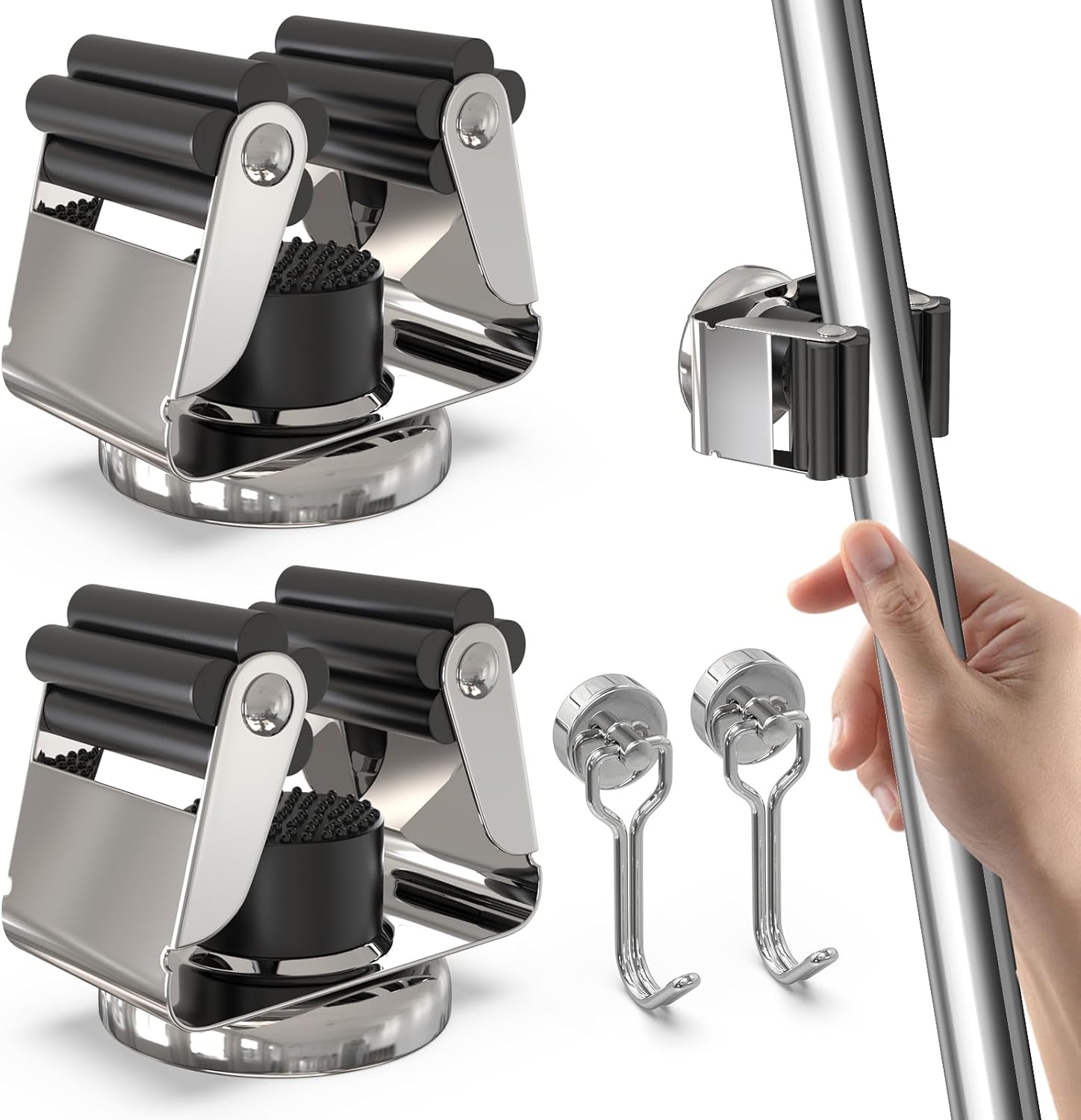 - π§²[PREMIUM QUALITY] It comes with 2 strong magnetic broom hanger and 2 magnetic hooks.For the broom holder wall mount with Anti-Rust stainless steel and the grip of the abrasion-resistant silicone grip keeps broom and dustpan,tools,shovels very well, mop and broom holder wall mount won't fall off easily last for years,for the magnetic hooks you can easily stick to the surface of refrigerator, iron door, iron filing cabinet