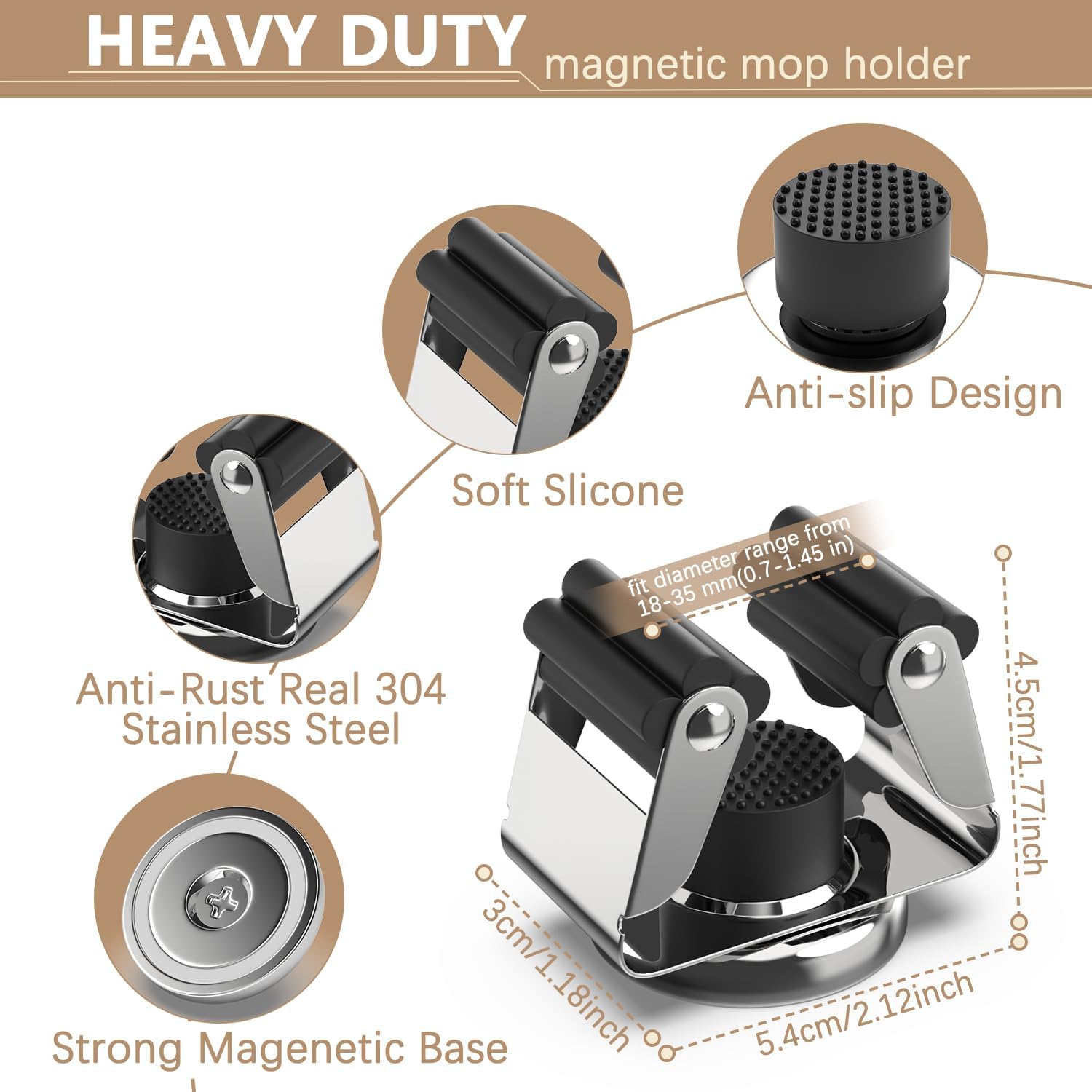 - π§²[SUPERB STABLE ] With broom and mop holder fit diameter range from 18-35 mm(0.7-1.45 in) by lifting the mop handle, the broom organizer wall mount rolling balls automatically adjust to each broom handle's thickness and grips it securely. silicone grip keeps tool handles away from slipping & scratching,magnetic broom holder heavy duty can grip up to 9 pounds cleaning tools and garden tools