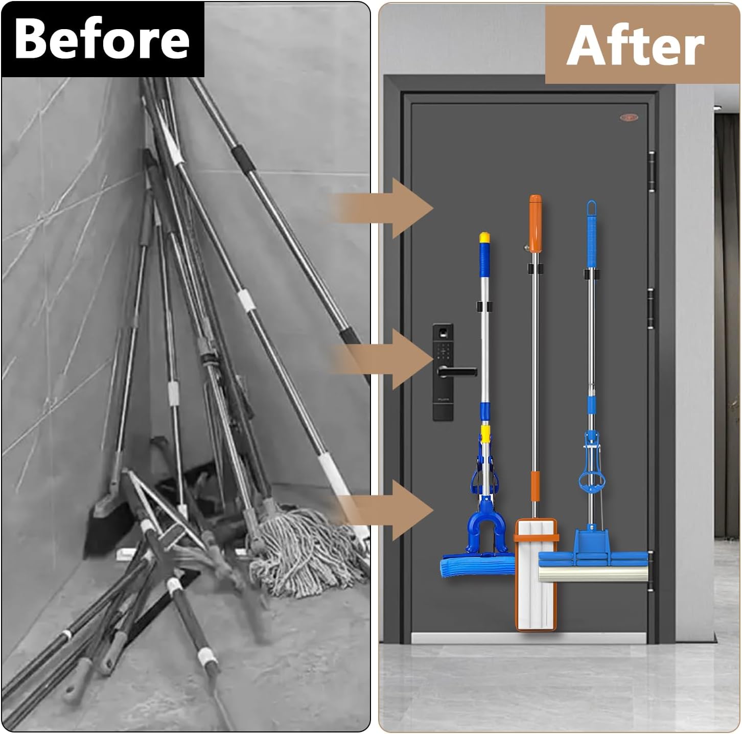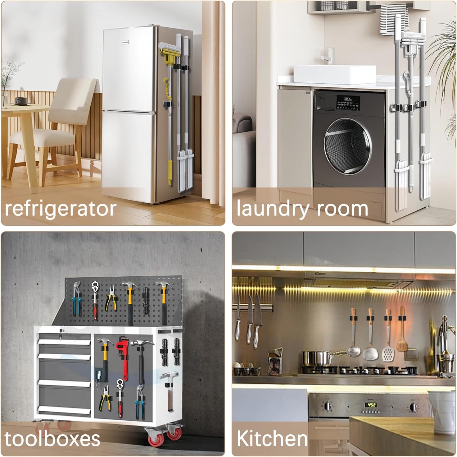 - π§²[INDOORS OR OUTDOORS ] Using mop and broom holder wall mount tidy up your broom, mop, rakes, tools and more! Perfect for the kitchen, closet, garage, office, great for commercial use, and thanks to the waterproof design, this magnet broom even works outdoors or on the shed for your garden tools when you are using the screws.