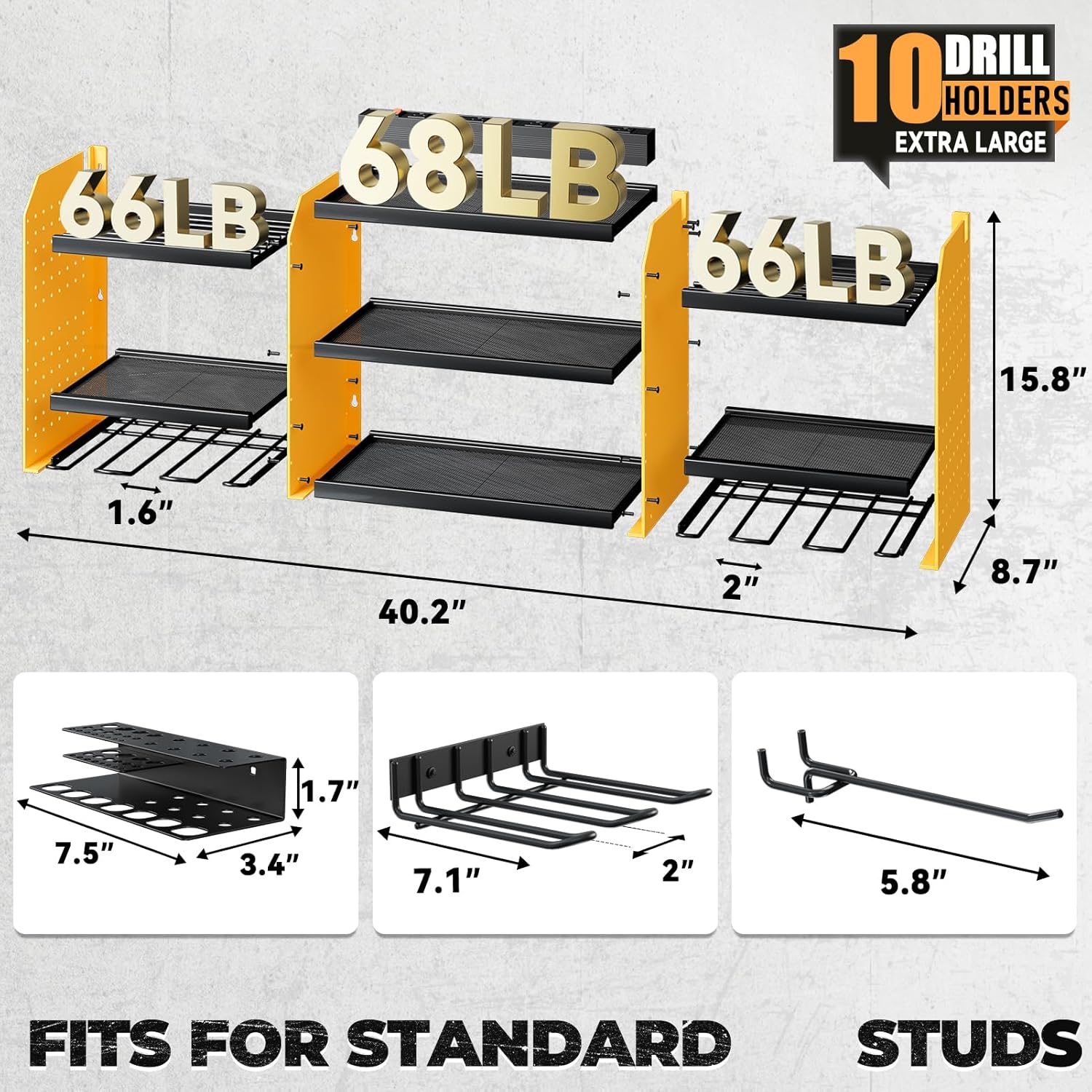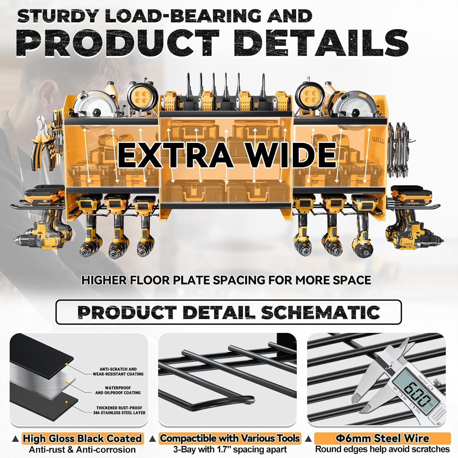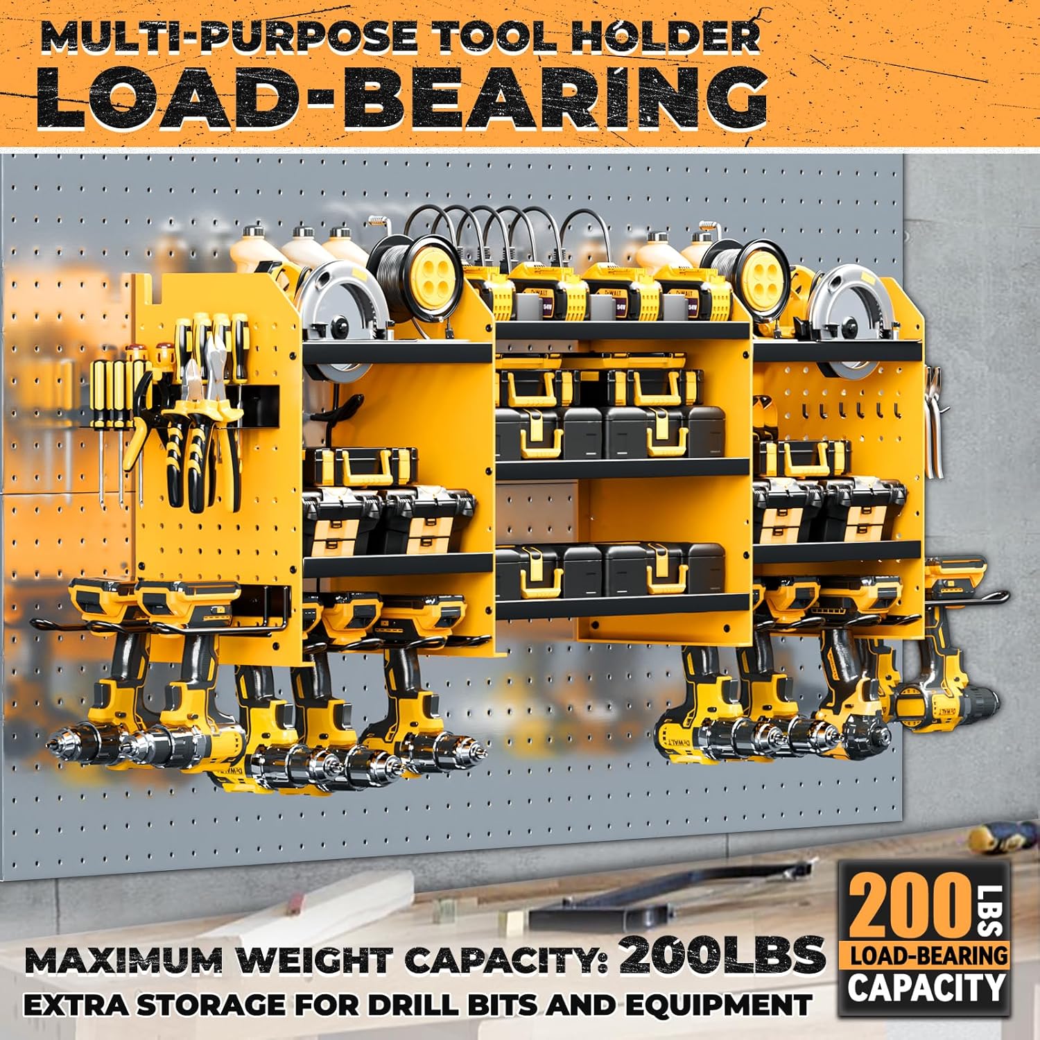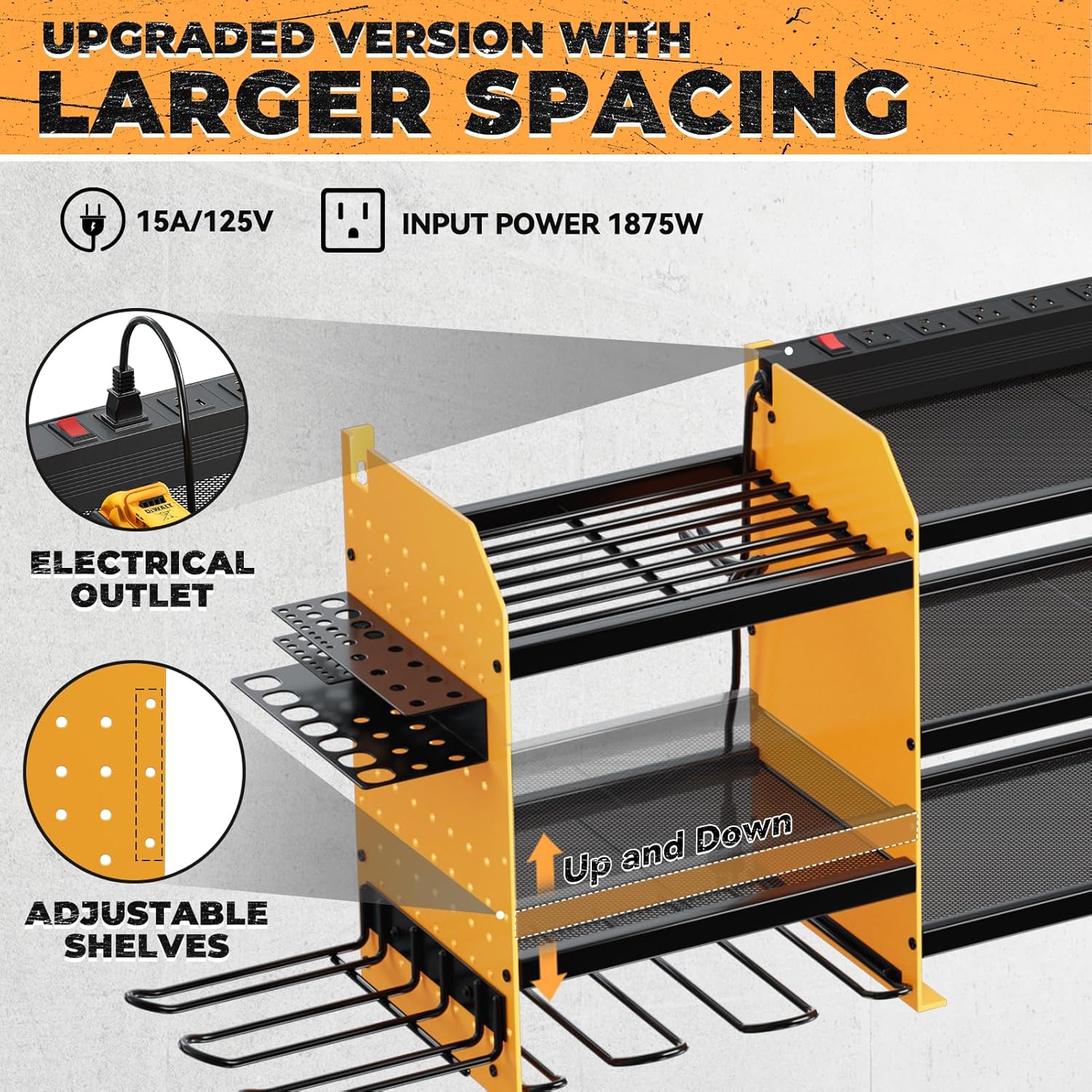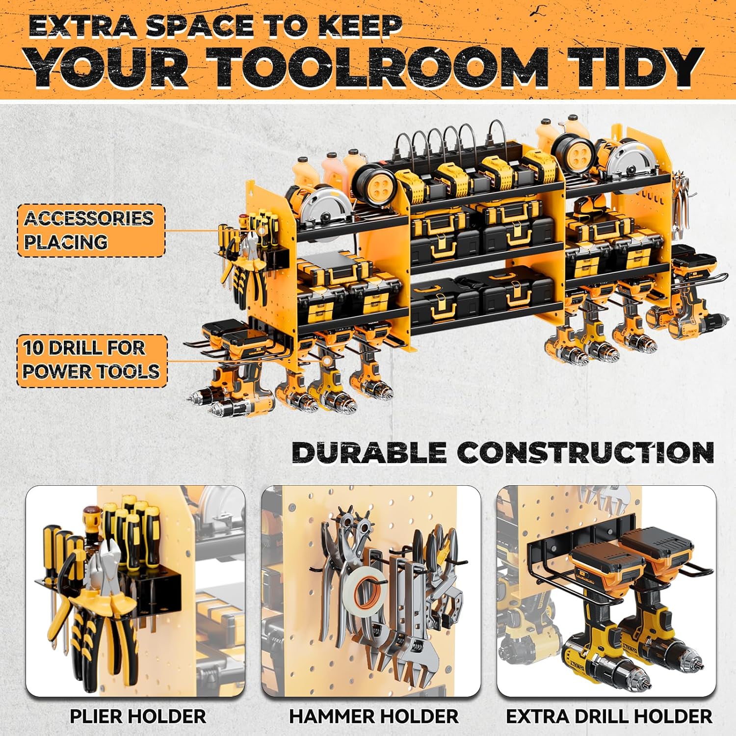 - [High-Capacity Storage]Wall mount power tools organizer features 10 drill holder, alongside a built-in power strip. Its double layer structure keeps rechargeable tools organized in the work area, saving bench space. Notably, the spacing between the middle tiers is significantly larger than typical market offerings(6.5FT).