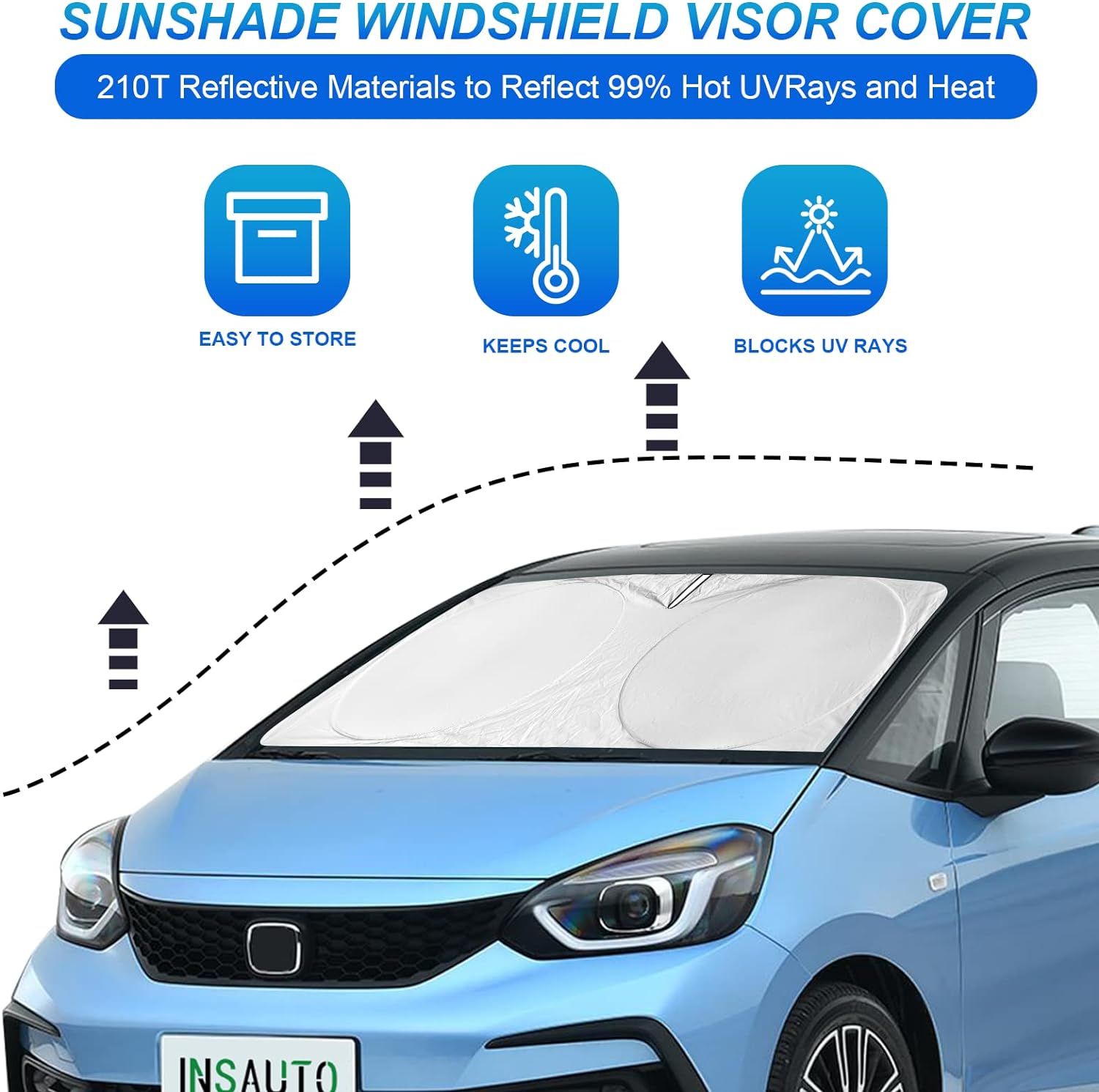 - [Windshield Heat Shield Cover]: Extreme UV rays often cause fading, cracking, and serious damage to your car interior, with Car Sunshade, you will surely have a long lasting and beautiful car interior for years! 2-layers material, effectively block 99% UV rays and heat, reducing temperature by up to 50-59Β°F. Keep your vehicle inside cool and prevents the inside of your car from over-heating.