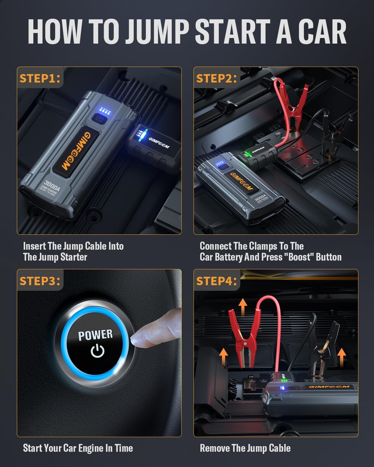 - ăPOWERFUL CAR JUMP STARTERăThe car battery jump starter is equipped with 3000A peak current to quickly start low voltage or completely drained car batteries. The jump starter has a 3 times enhanced current compared to the old 2nd generation and can start up to 9.0L gas and 7.5L diesel engines. Suitable for 12V cars, trucks, motorcycles, boats, RV's or lawnmowers, etc.