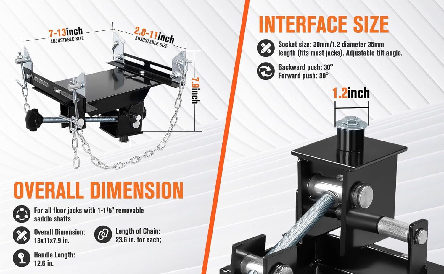 - Universal transmission jack adapter adjustable for multiple angles.Designed to convert floor jack into transmission jack.Suits most automotive transmissions, standard floor jacks and gears.Also fits rear axle units with removable saddle shafts