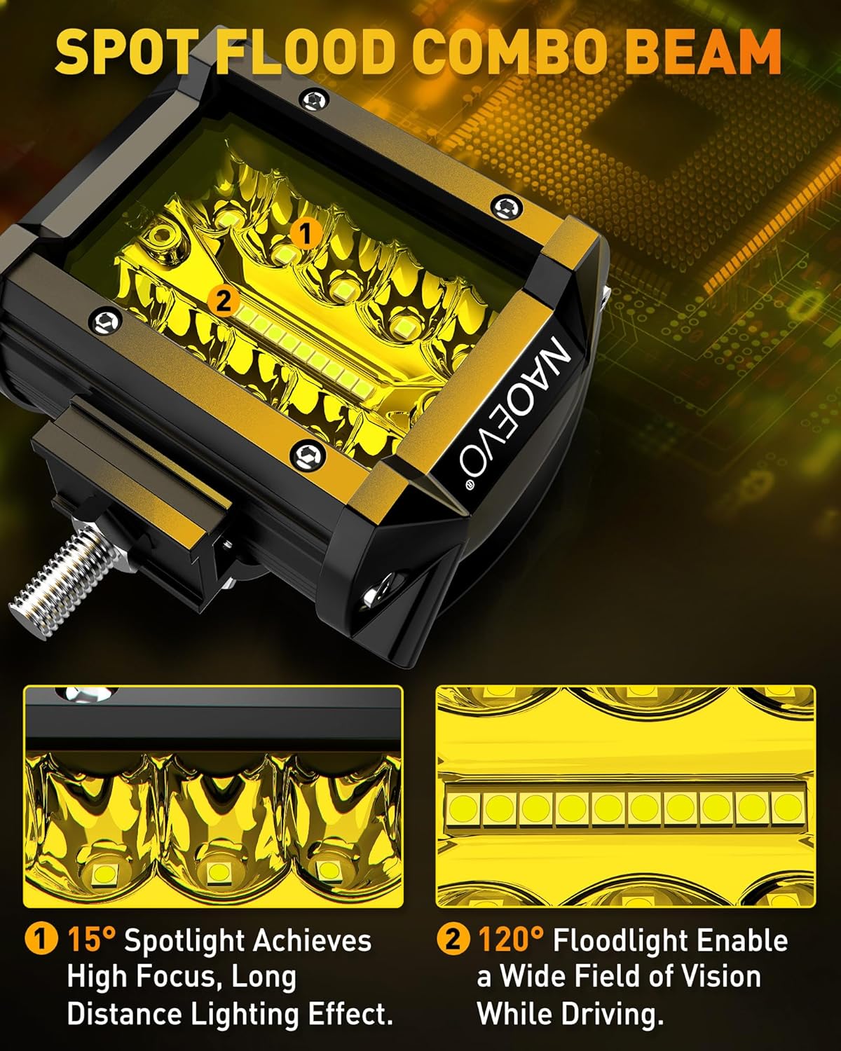 - [Spot Flood Combo LED Light Pods] - NAOEVO 4 inch led pods features 15Β° spotlight beam to provides high-focus, long-range visibility, while the 120Β° floodlight beam provides broader coverage. The powerful combo provides stronger lighting effect than other single-function led lights, catering to a range of lighting demands.