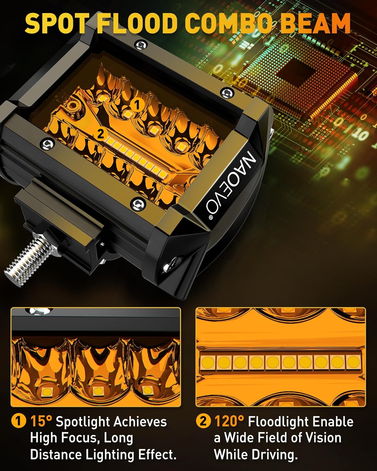 - [Spot Flood Combo LED Light Pods] - NAOEVO 4 inch led pods feature 15Β° spotlight beam to provide high-focus, long-range visibility, while the 120Β° floodlight beam provides broader coverage. The powerful combo provides a stronger lighting effect than other single-function led lights, catering to a range of lighting demands.