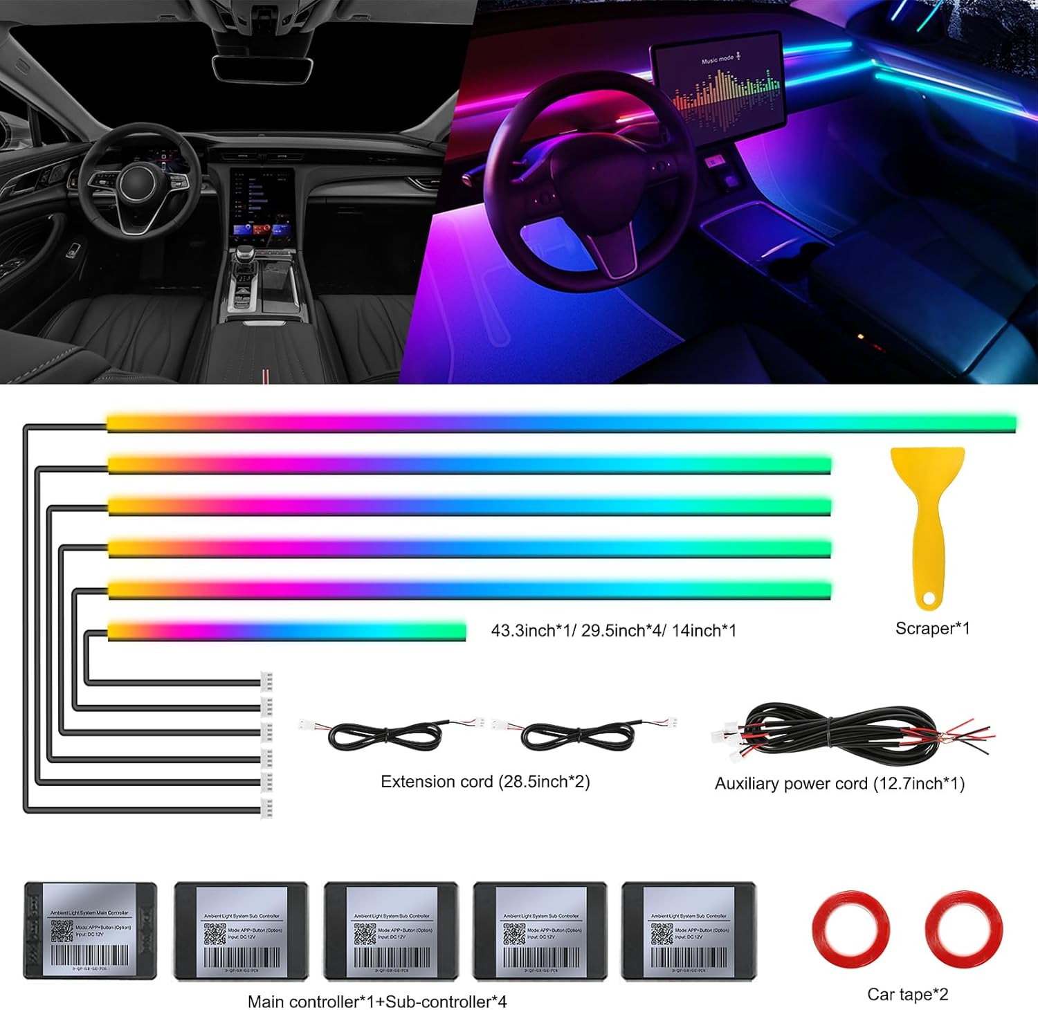 - ăHigh Bright & UniformăThe Dream+color Acrylic Car Ambient Interior Lighting have super bright LED and acrylic lens and contains 6 LED strips (4*29.5inch+1*43.3inch+1*14inch), also comes with 1 main controller and 4 sub controllers,and can be flexibly installed on any car by DIY without disorganized, which is plug and play, and this acrylic light evenly spread over the lamp strip is brighter, more uniform and softer than other optical fiber lamps that rely on only one LED.