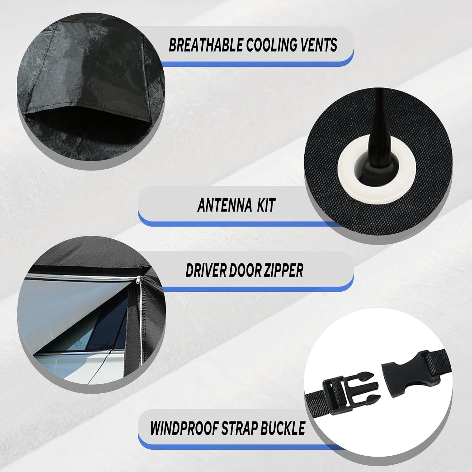 - ăMultifunctional Designă1. ATHUPEAD SUV car cover has three buckle-type reinforced windproof straps in the front, middle, and back, which can resist strong winds. 2. There is a door zipper on the driver's side for easy access to items. 3. The unique reflective strip design reminds others at night to ensure parking safety. 4. There are vents on the side of the car cover, which can prevent moisture accumulation inside and keep it dry, allowing for faster ventilation in summer. 5. The SUV car cover provides an antenna protection kit. If your car has a fixed antenna, you can refer to the video on YT to DIY an antenna port on the top of the car hood.