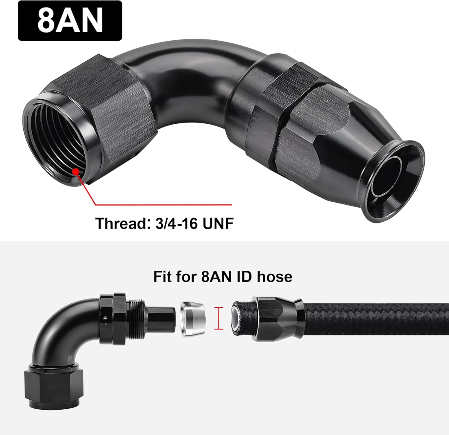 - [Product Size & Parameter] Size: 8AN. Thread Size: 3/4-16 UNF. Working Pressure: 1500PSI. Working Temperature Range: -40Β°F-250Β°F. Angle: 90 Degrees. Note: Please verify the hose size before purchase.