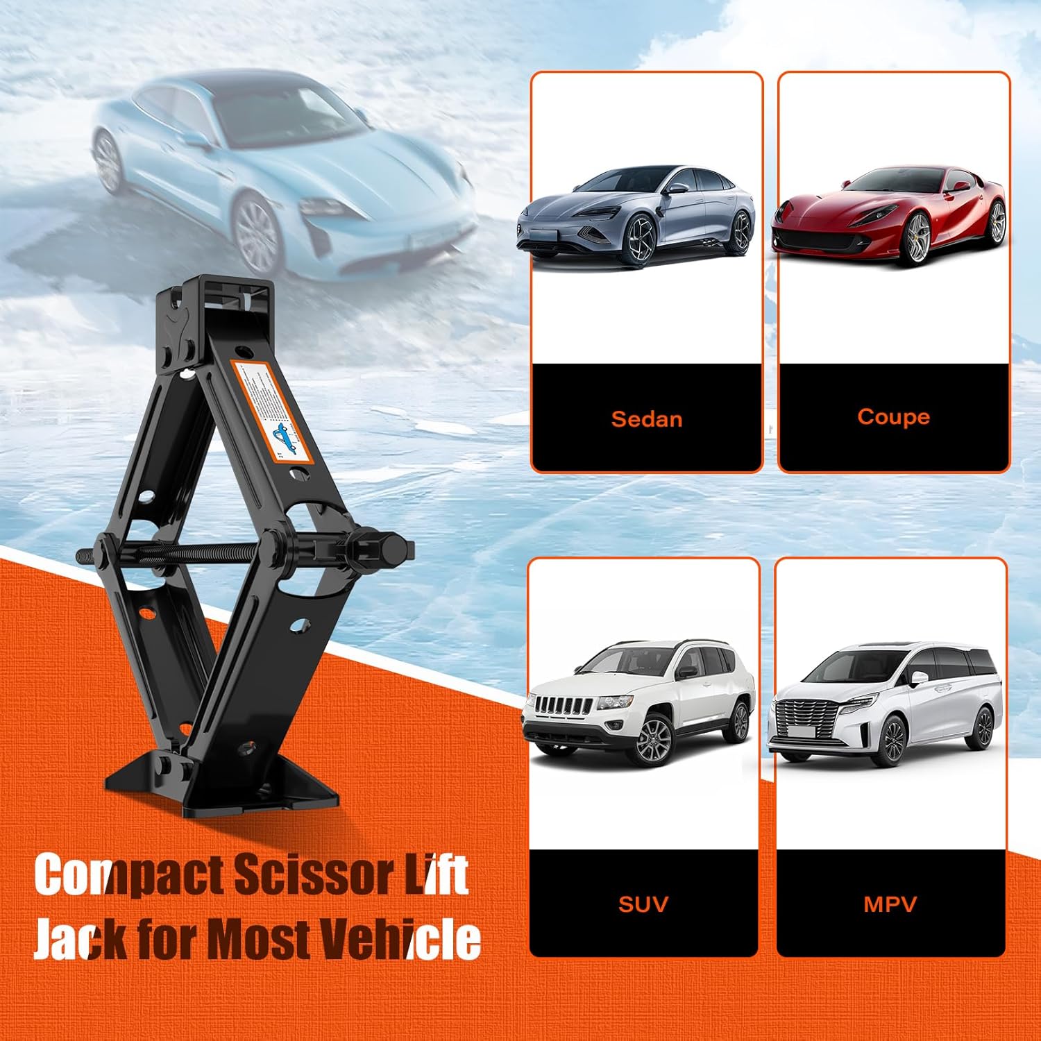 - 【Universal Car Emergency Kit】This portable 2 ton car jack is universally compatible with Sedans, SUVs, MPVs, and other vehicles. It is perfect for emergency situations where you need to change a flat tire, remove a stuck wheel, or perform other vehicle repairs.Plus, its compact size makes it easy to store in your trunk or backseat.