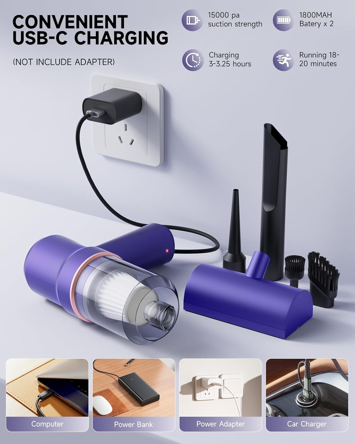 - ăConvenient Cordless & Rechargeable DesignăEnjoy cord-free use with this hand vacuum cordless rechargeable unit (dual 1800mAh batteries). As a reliable hand held vacuum, it recharges via included Type-C charging cable (Needs Adapter) from car charger, power bank, laptop. Flexible charging suits mobile use. A 3-hour fully charged yields 20 minutes of strong suction. Allows substantial cleaning without cord limits, enhancing usability anywhere.