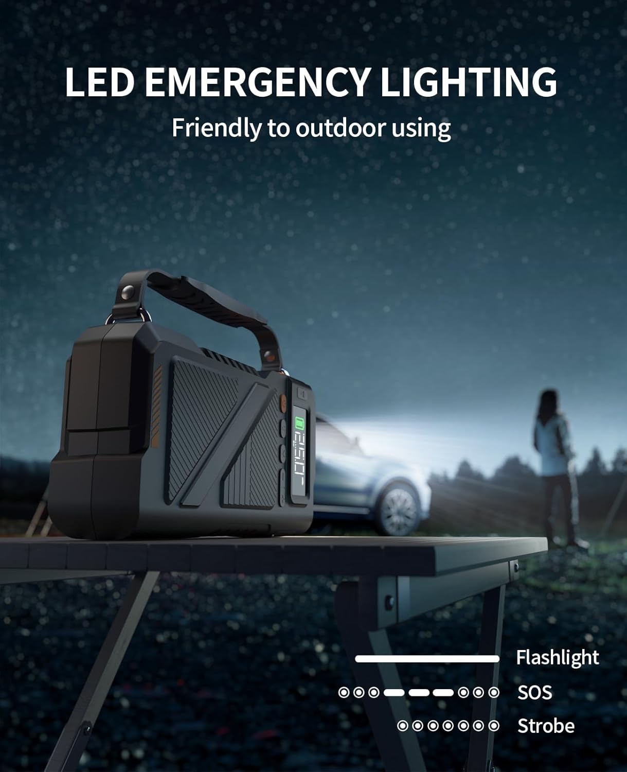 - Portable Power Bank Function & Emergency Lights: The jump starter design with a rope for easy carrying and portability. It also features 18W output. Extra equipped with LED emergency lighting funciton to work as a nice outdoor camping tool
