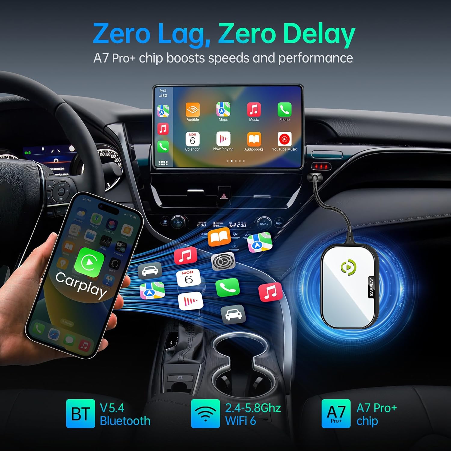 - Upgraded Chip, Smooth Performance - Featuring the latest 2024 upgraded smart IC chip and processor, this apple carplay adapter ensures a strong, fast, and stable wireless connection, significantly reducing interruptions and latency. It supports voice control, steering wheel controls, touchscreens, and knobs for an unparalleled user experience.