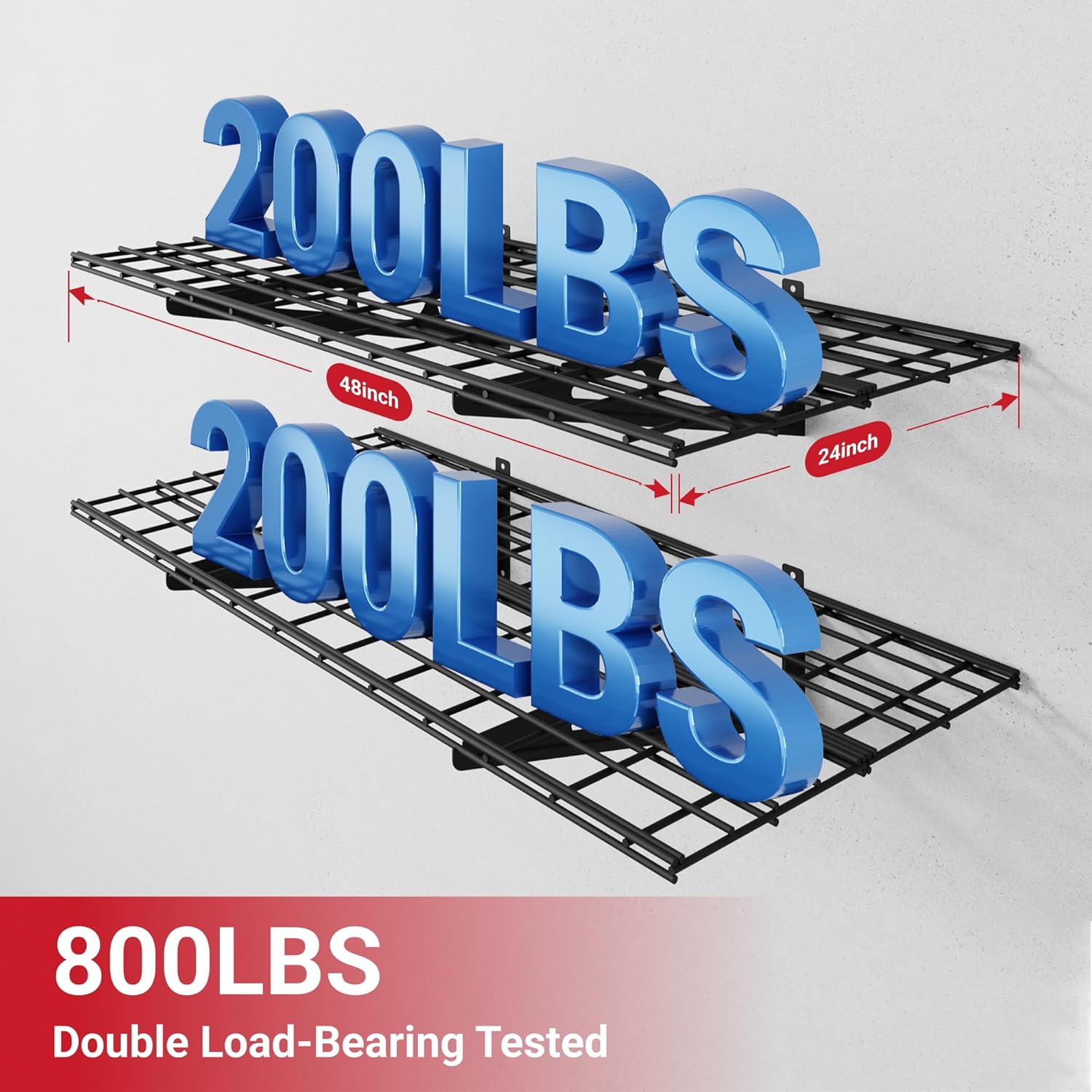 FLEXIMOUNTS 2-Pack 2x4ft Garage Shelving with Hooks, 24-inch-by-48-inch Wall Shelf Garage Storage Racks Floating Shelves, Black