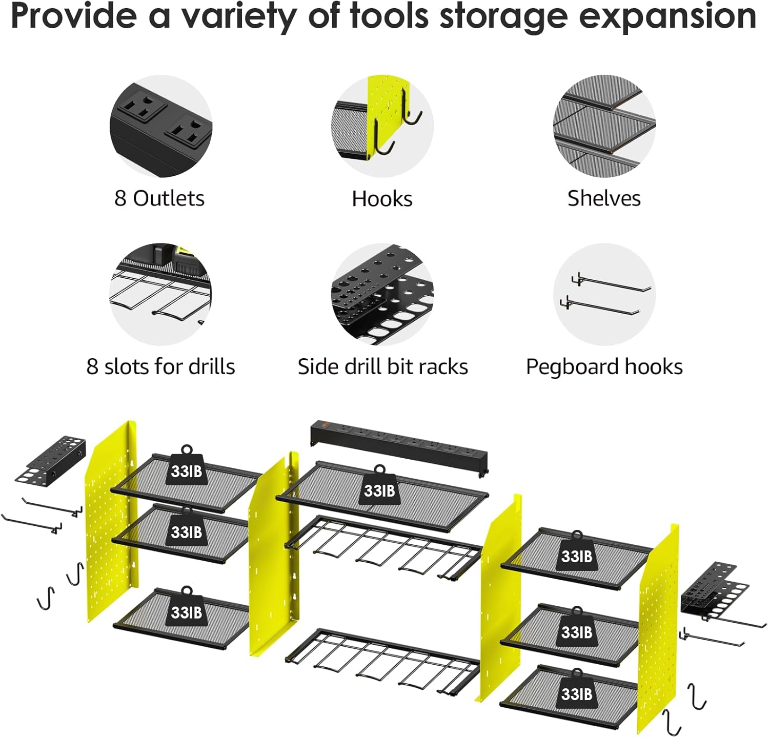 - Green wall mount power tools organizer with power strip, pegboard design, 8 slots, 4 hooks, 4 pegboard hooks and 2 side tool organizer, 3 layer structure shelf and one layer adjustable for actual needs, can keep rechargeable tools organized in the work area and save your bench space.