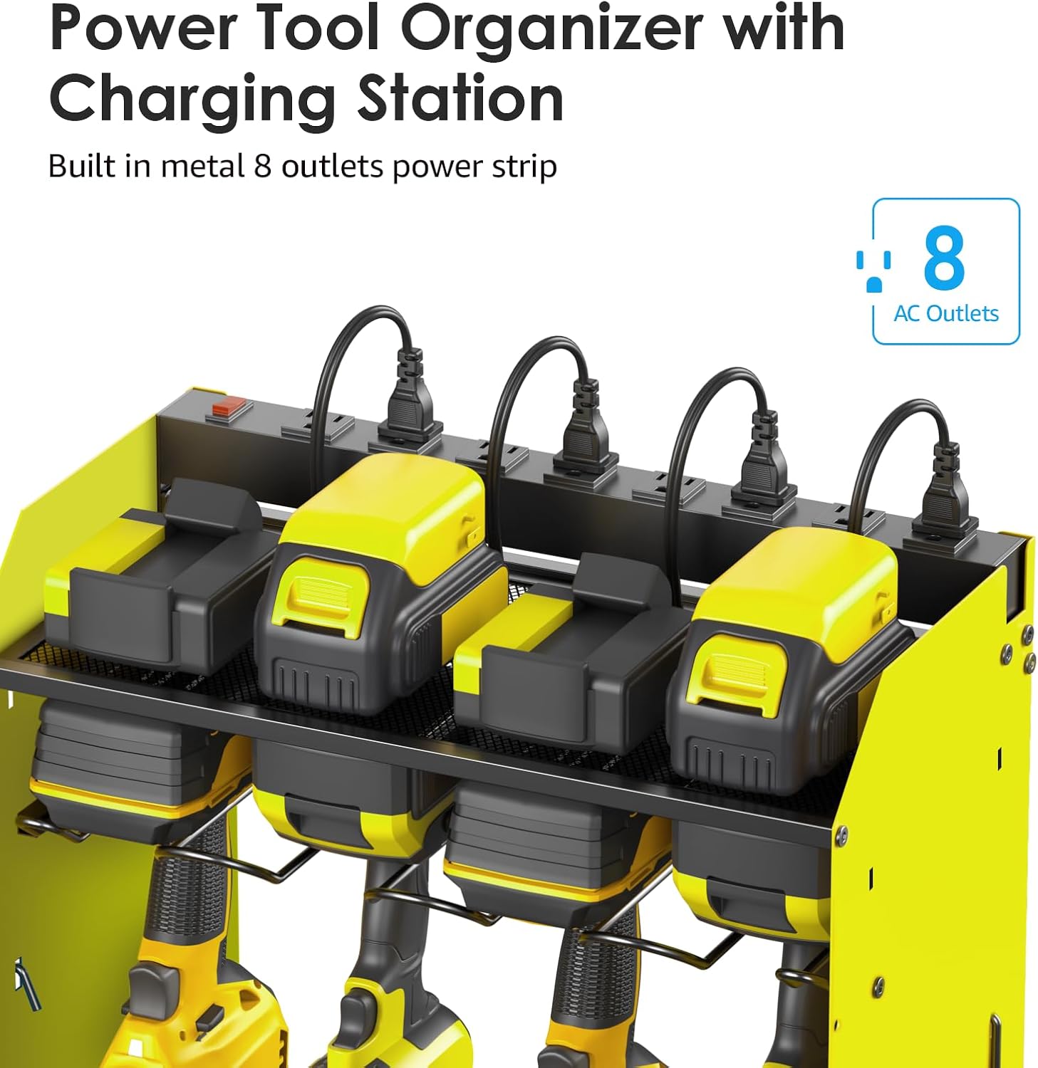 - About large size 39 inch long power tool organizer with charging station, provides large enough storage space for 8 drills and 7 shelves. 8 outlets for cordless drills and tools batteries put together. The tools in the picture are for demonstration purposes only and are not included.
