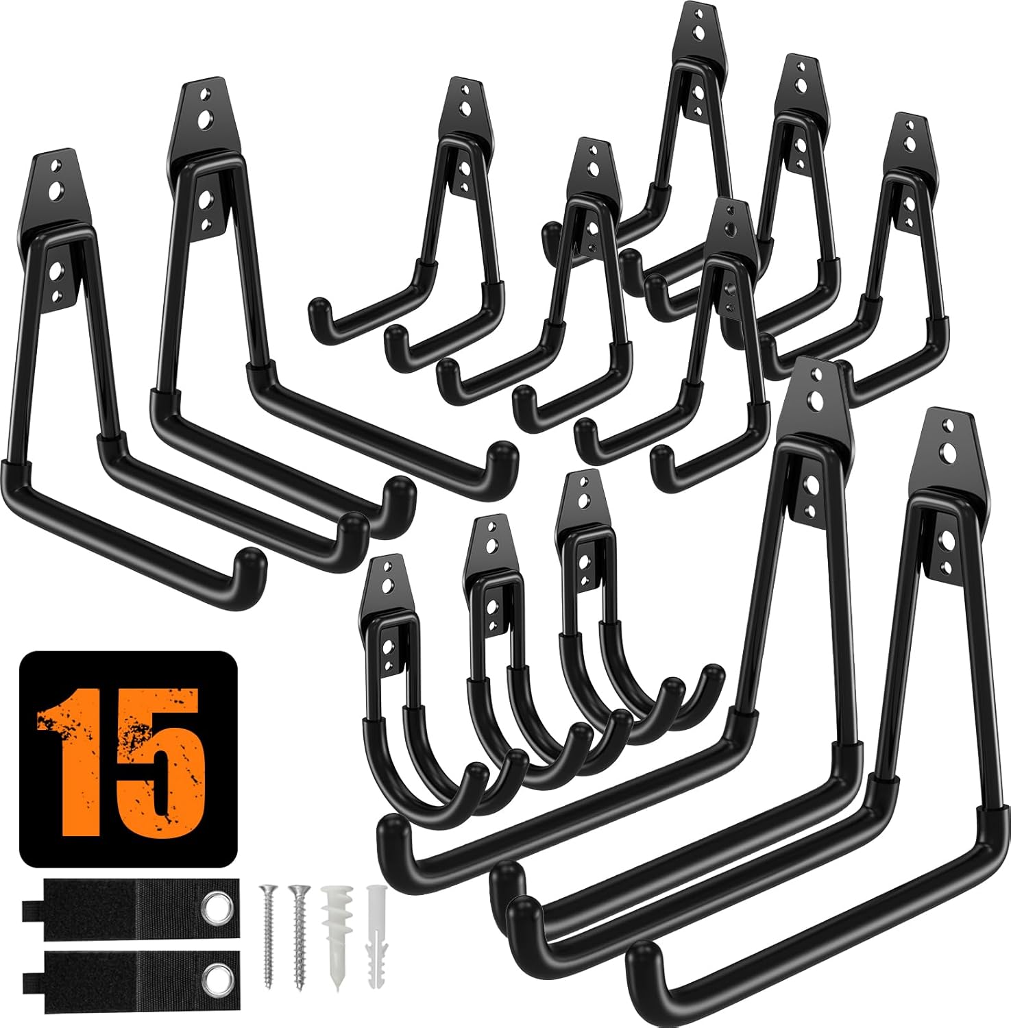 QcoQce 15 Pack Garage Hooks Heavy Duty with 2 Extension Cord Straps,Garage Storage Hooks, Wall Mount Hooks, Garage Organization and Tool Hangers for Bike, Ladder, Ropes and Garden Tools