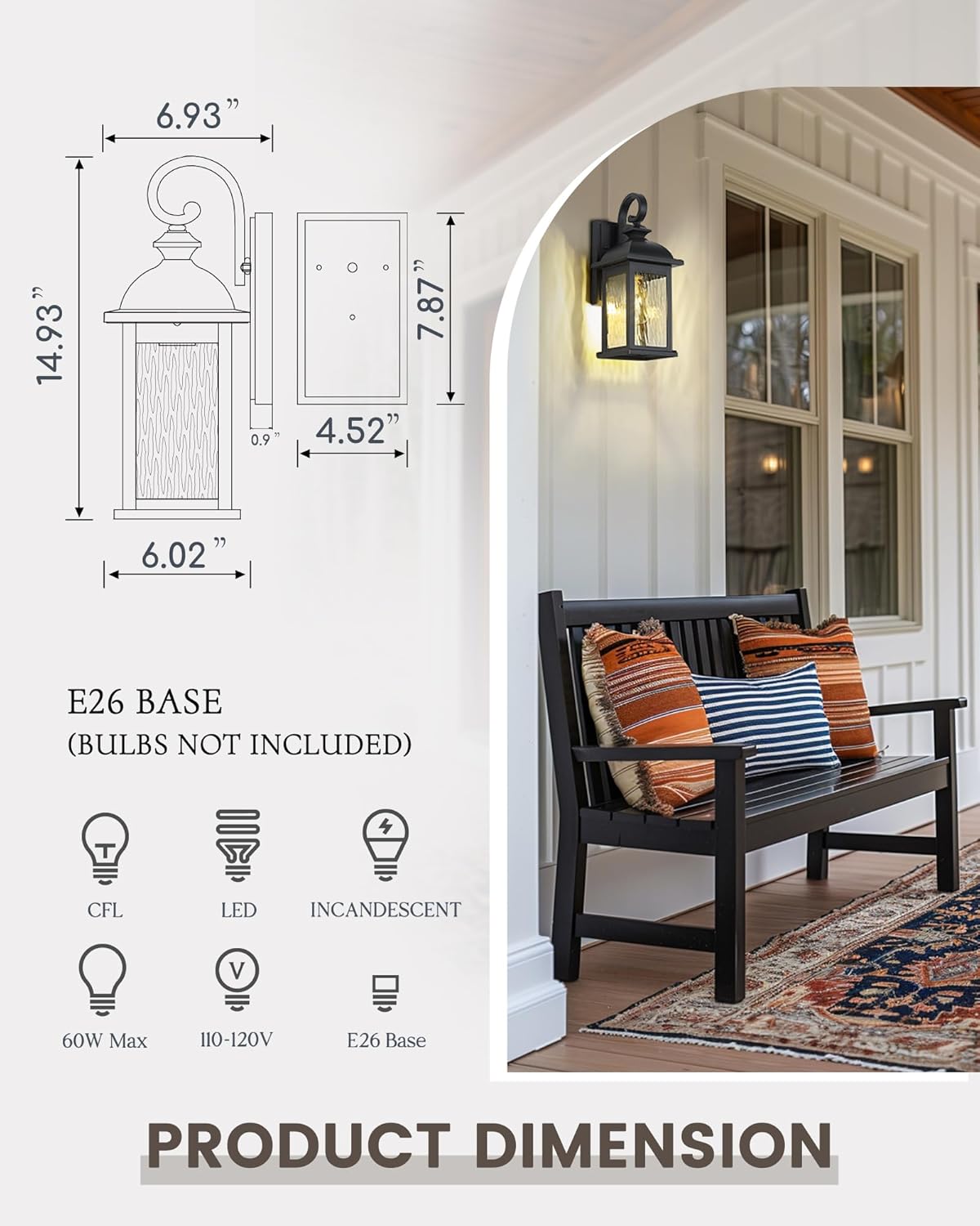 - Elegant Modern Design: This modern outdoor wall light features a timeless lantern design with water-rippled glass, adding a refined touch to your exterior spaces. Perfect for enhancing the visual appeal of your outdoor wall light fixtures, this fixture also serves as a striking element for your front porch light.