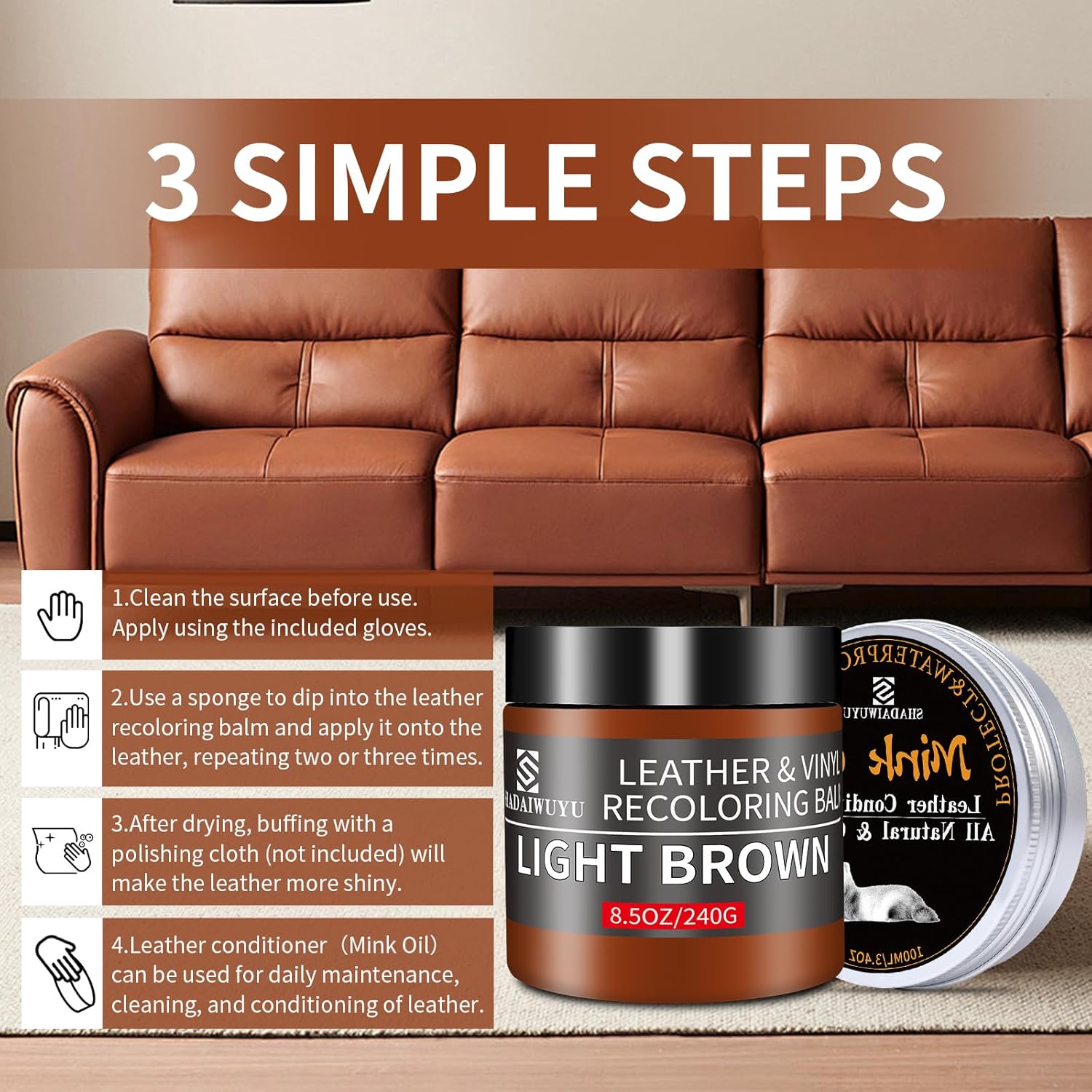 - 【Leather Repair Kit for Furniture】Our Leather Conditioner with Mink Oil is formulated for quick and easy application, providing comprehensive care for your leather furniture. This Leather Recoloring Balm and Repair Kit is designed to restore leather surfaces to their former glory, enhancing longevity and maintaining a vibrant appearance.
