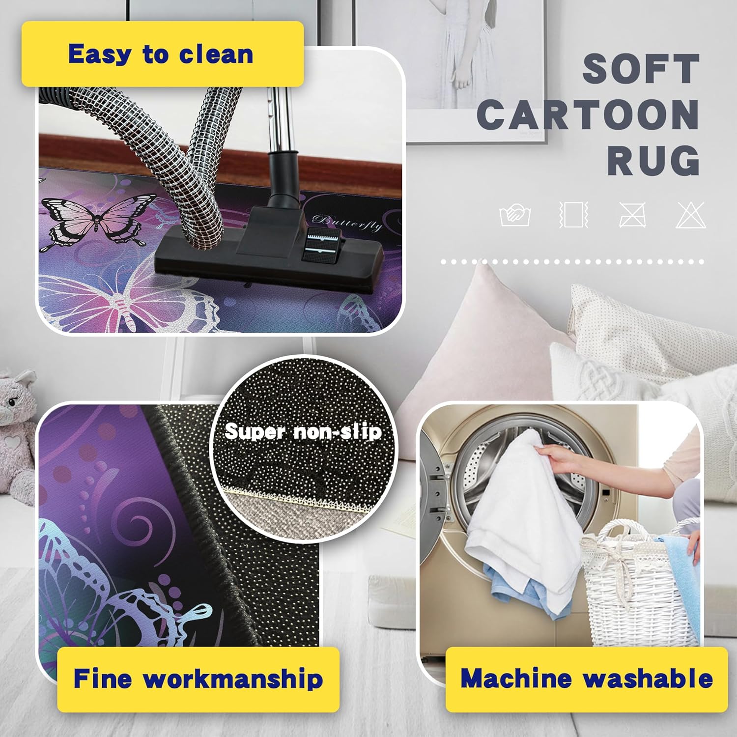 Beautiful Butterfly Fantasy Rug for Playroom Girls Bedroom Colorful Rainbow Butterfly Decor Area Carpet 59"x39" Purple Mat 3D Printed Non-Slip Washable