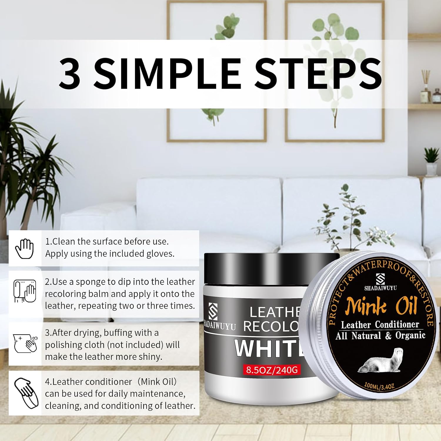 8.5oz Leather Recoloring Balm with 100ml Mink Oil,White Leather Repair kit for Furniture and Car Interior,Leather Couch Scratch Repair,Leather Dye Paint,Mink Oil for Leather