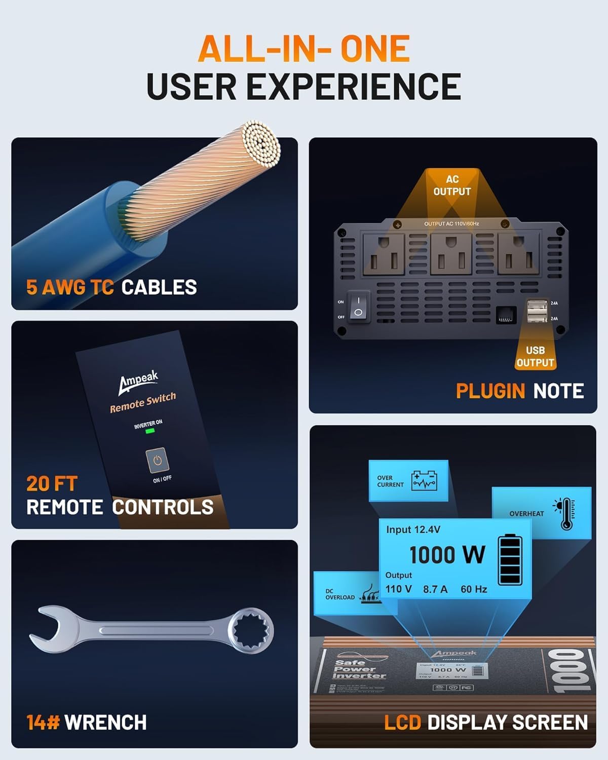 - Precision LCD Display: Ampeak 1000w power inverter features a state-of-the-art internal software that enhances the accuracy of the LCD display, making it effortless to read vital information such as input/output voltage, current, and power. This ensures seamless data management and a stable power supply for all your devices.