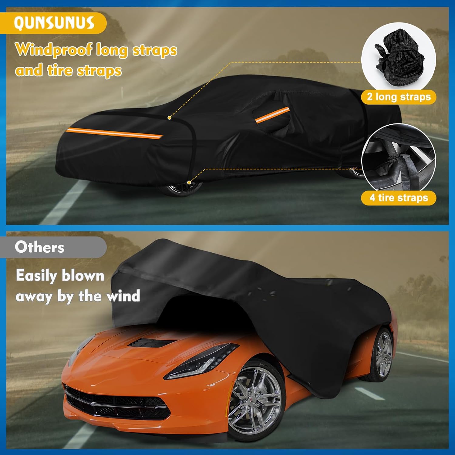 QUNSUNUS Waterproof Car Cover for C7 Corvette 2014-2019, Outdoor Car Covers with Zipper, All Weather Full Exterior Cover with Straps and Elastic Edges for Wind, Sun, UV and Dust Protection