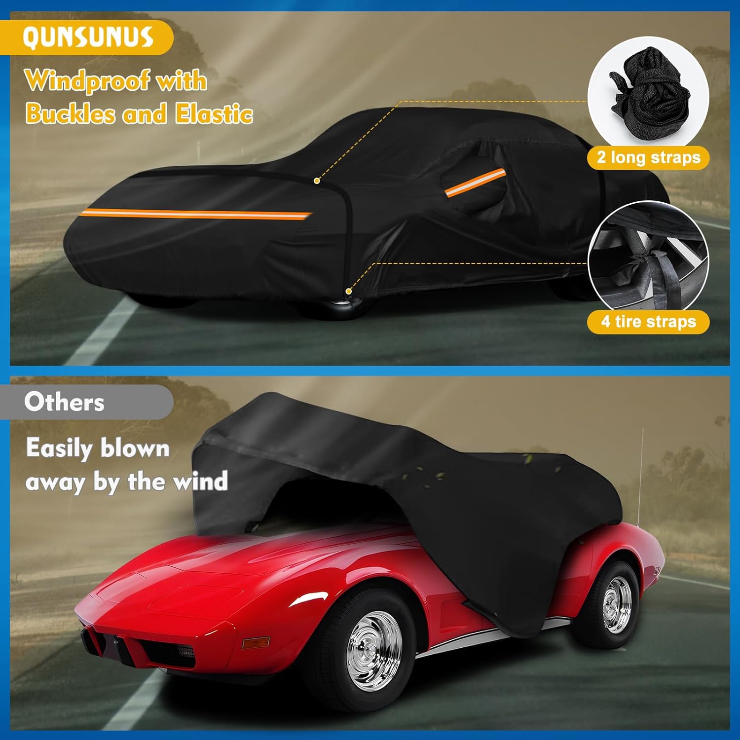 - ăWindproof Design-Stay in Placeă*1. Four straps used on the four wheels to make sure the cover stay in the place. *2. A windproof buckle pass through the middle of the car. *3. Elastic Strap at the bottom of front and rear to ensure cover fit your car and to protect your car cover from blowing off, even in heavy wind.