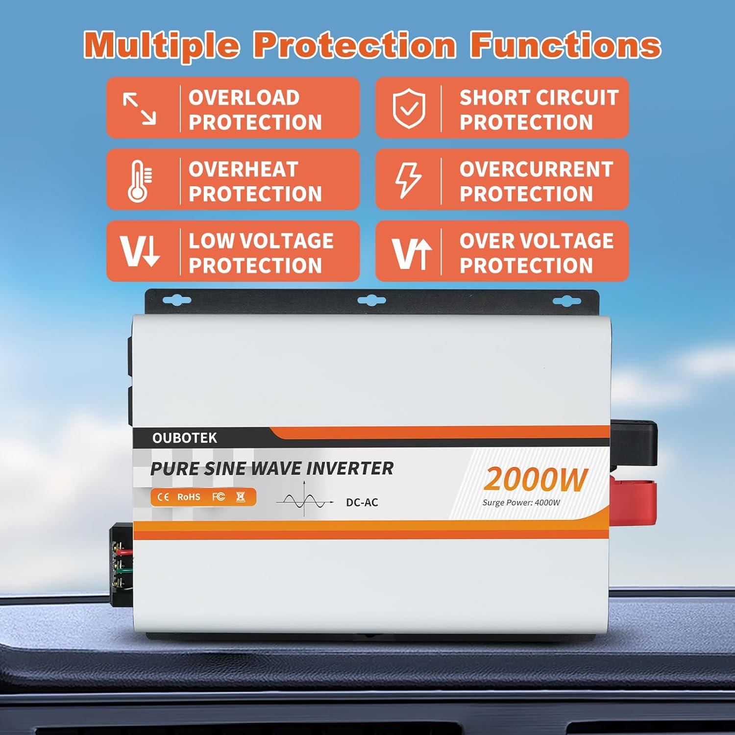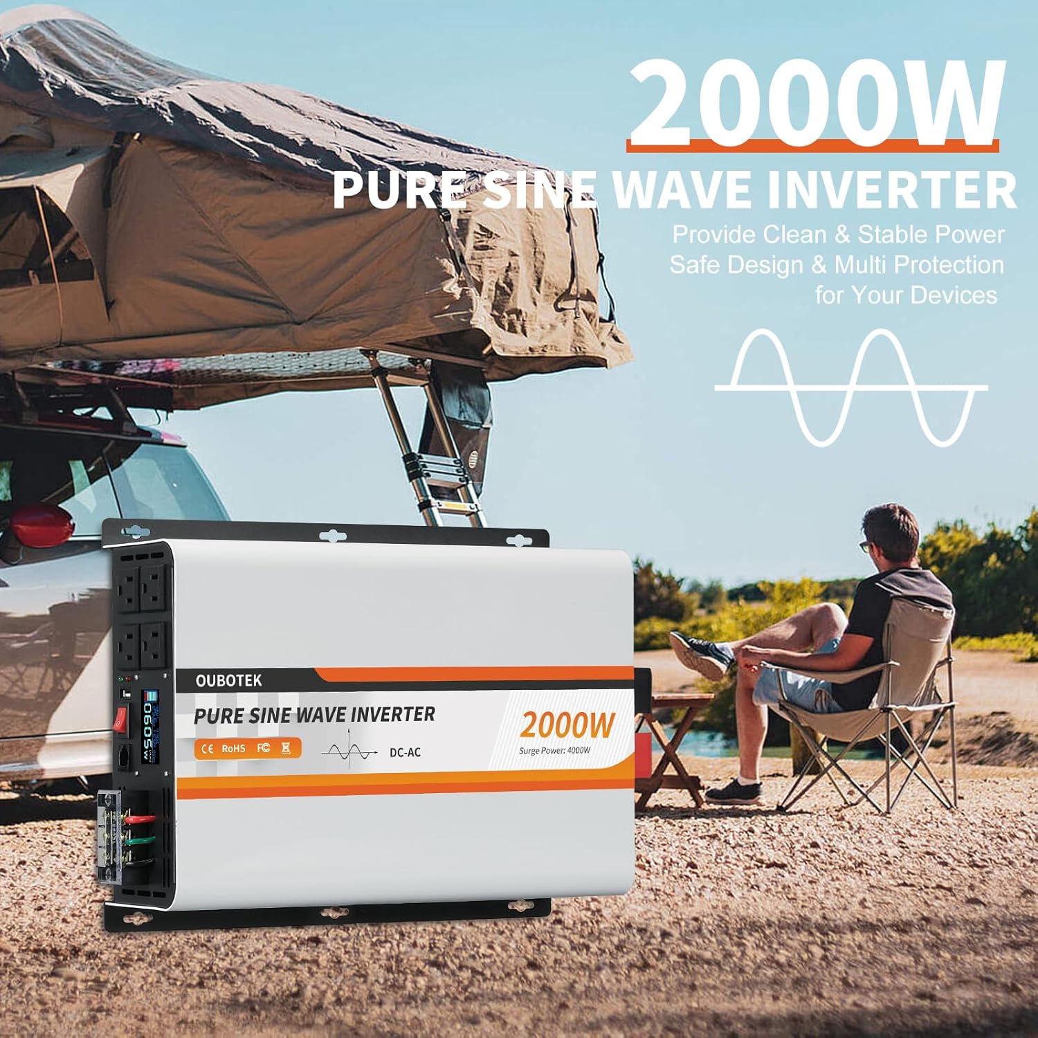 - POWERFUL 2000W PURE SINE WAVE INVERTER: The OUBOTEK inverter provides 2000W continuous and 4000W peak power, converting DC 24V to AC 120V. It delivers clean, efficient pure sine wave power, ideal for sensitive electronics and appliances