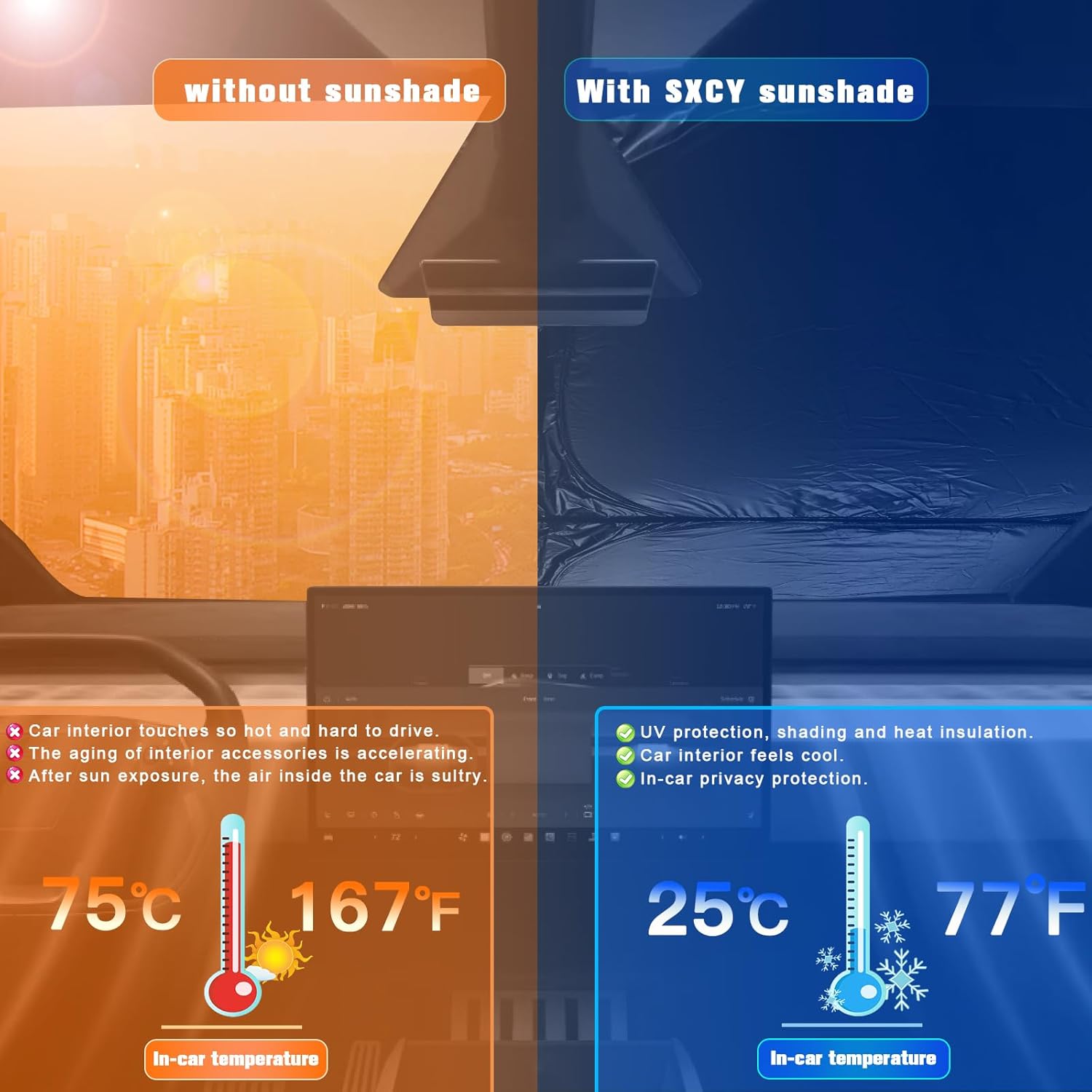 - 2.Sun Protection: Solve your concerns about parking for a long time under the scorching sun,prevent the car's interior from getting sunburned and extend your car interior accessories’life.