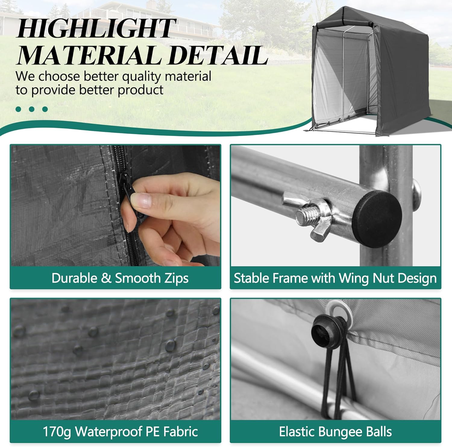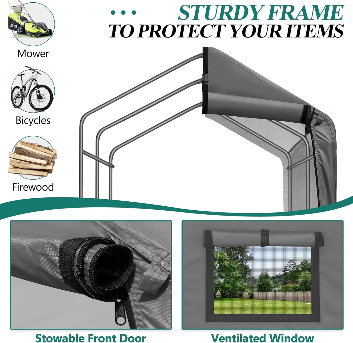 - 🚲Convenient Design: The cycle house is made of high-density polyethylene fabric, which is waterproof and durable. We adopt the front curtain type with zippers on both sides of the door. The bike garage is surrounded by a roof and walls to protect your valuable stored items from rain, sun, and dust.