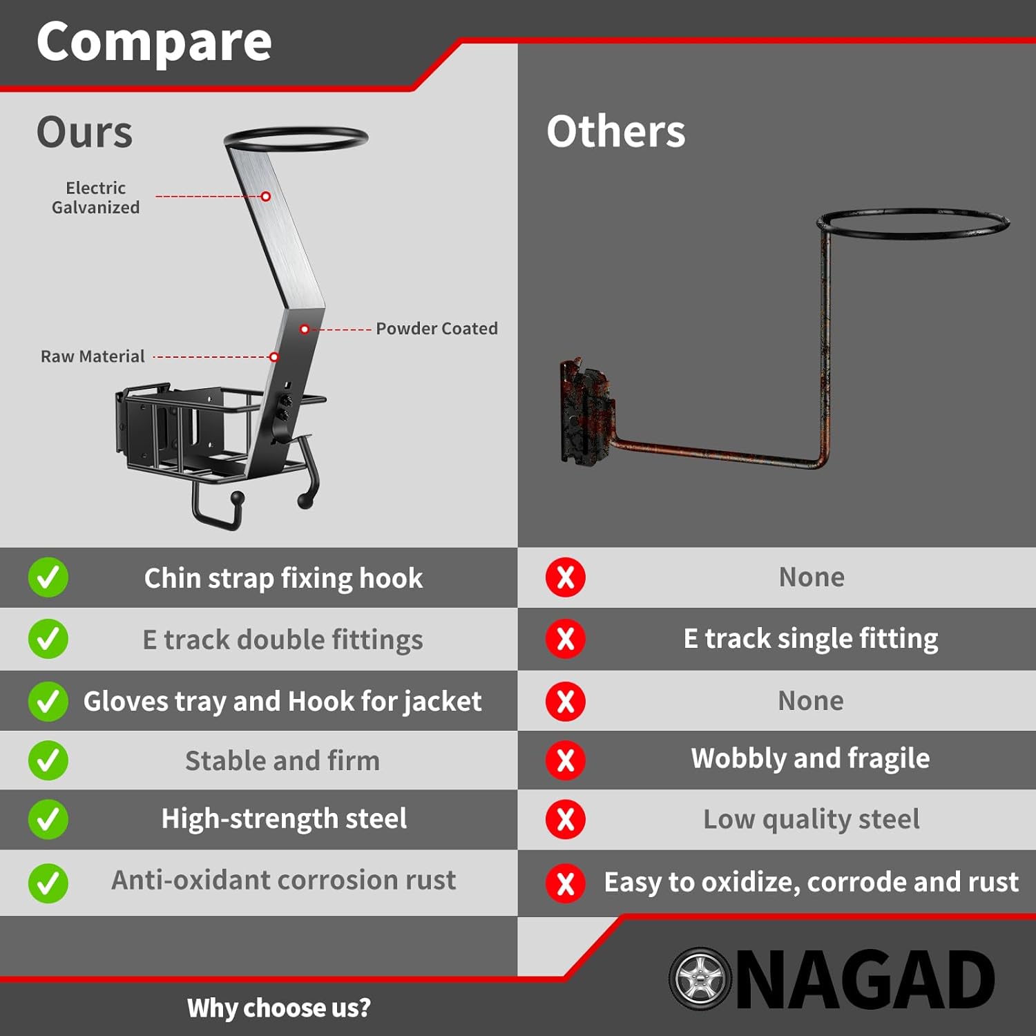 - Durable Material: The e track motorcycle helmet hanger is a miracle worker! Made of thicker heavy-duty steel with black powder-coating, which have strong load-bearing capacity and are not easily deformed to prevent corrosion and rust for long-term use. Compared to ordinary helmet hooks, the design of the top support ring increases the contact surface with the helmet for better storage and protection.