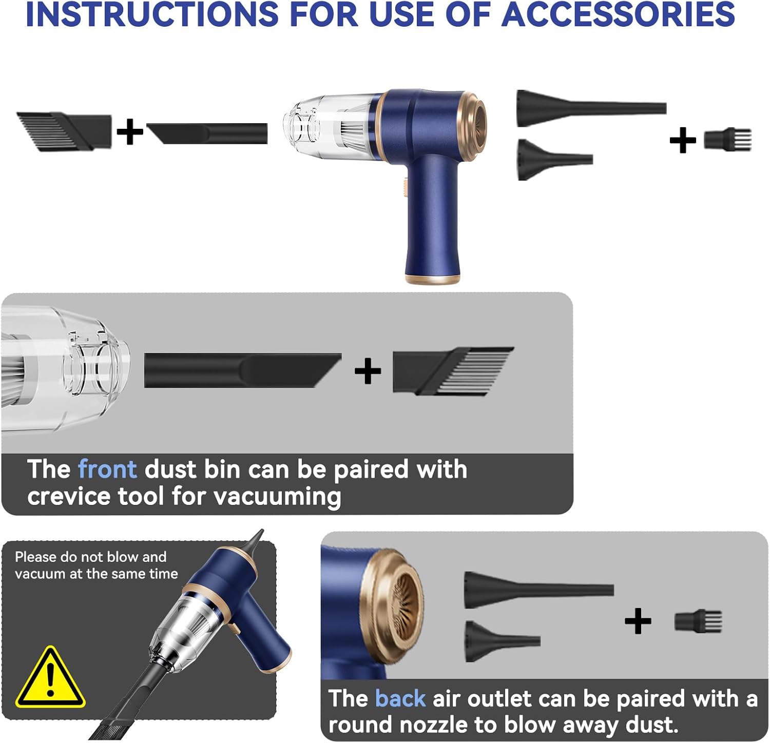 - Air Duster & Vacuum Cleaner 2 in One: You can easily use it to blow away dirt, debris, dust, and other particles on the surface of objects, as well as suck out tiny stubborn dirt hidden in keyboards, corners, and crevices. Vacuum on the front and blow on the back. Please note that different nozzles correspond to different interfaces on the front and back of the vacuum cleaner.