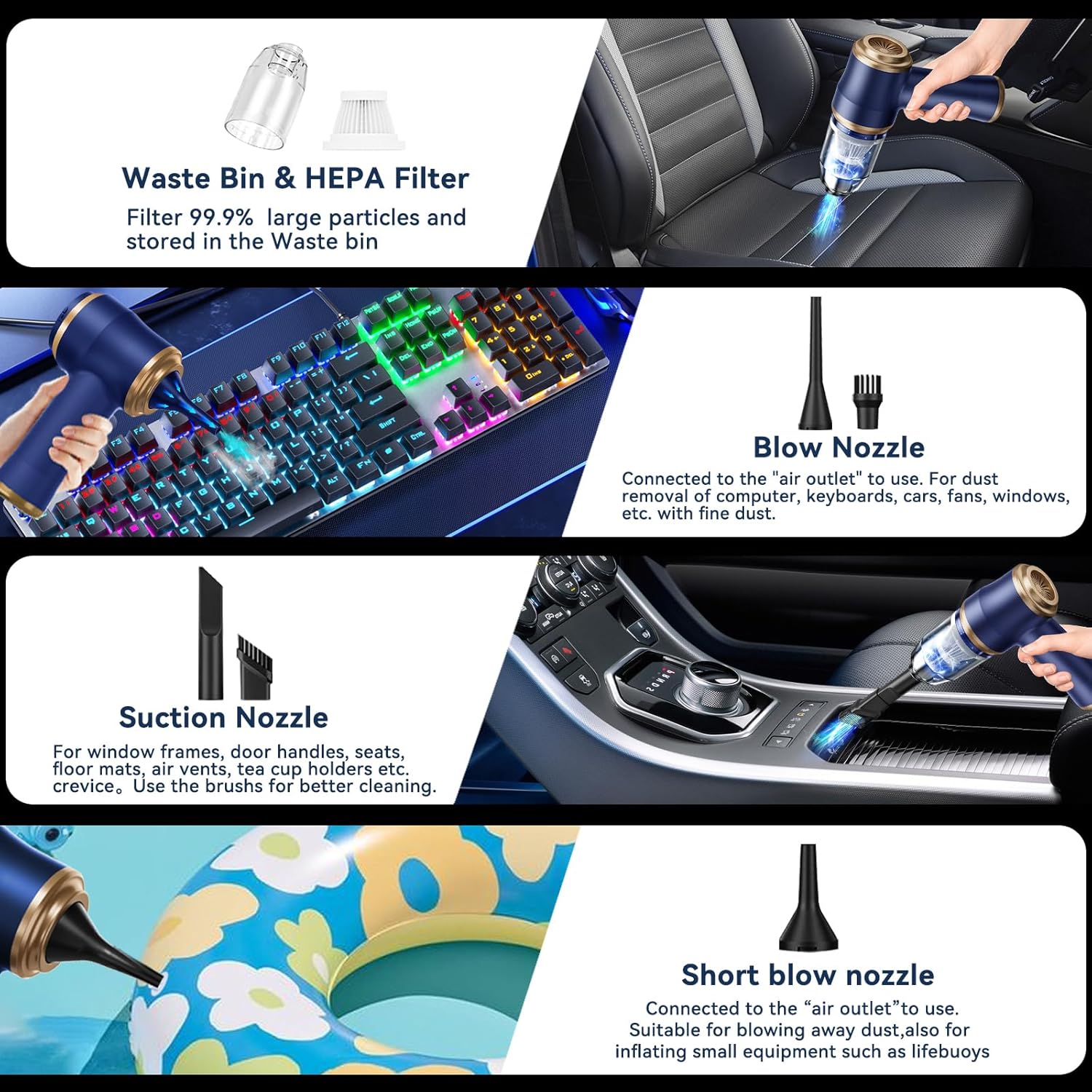 - Multi-Nozzles & Fine Cleaning:Crevice Tool access difficult to reach areas such as between sofa cushions and used to vacuum in narrow, irregular crevices in furniture, car interiors, small edges, and more . The portable car vacuum is also equipped with various detachable brush head nozzle accessories, which are very suitable for helping you deeply clean cars, keyboards, cameras, electronics, air conditioning, sofas, windows, pets, plants, etc., or for inflation.