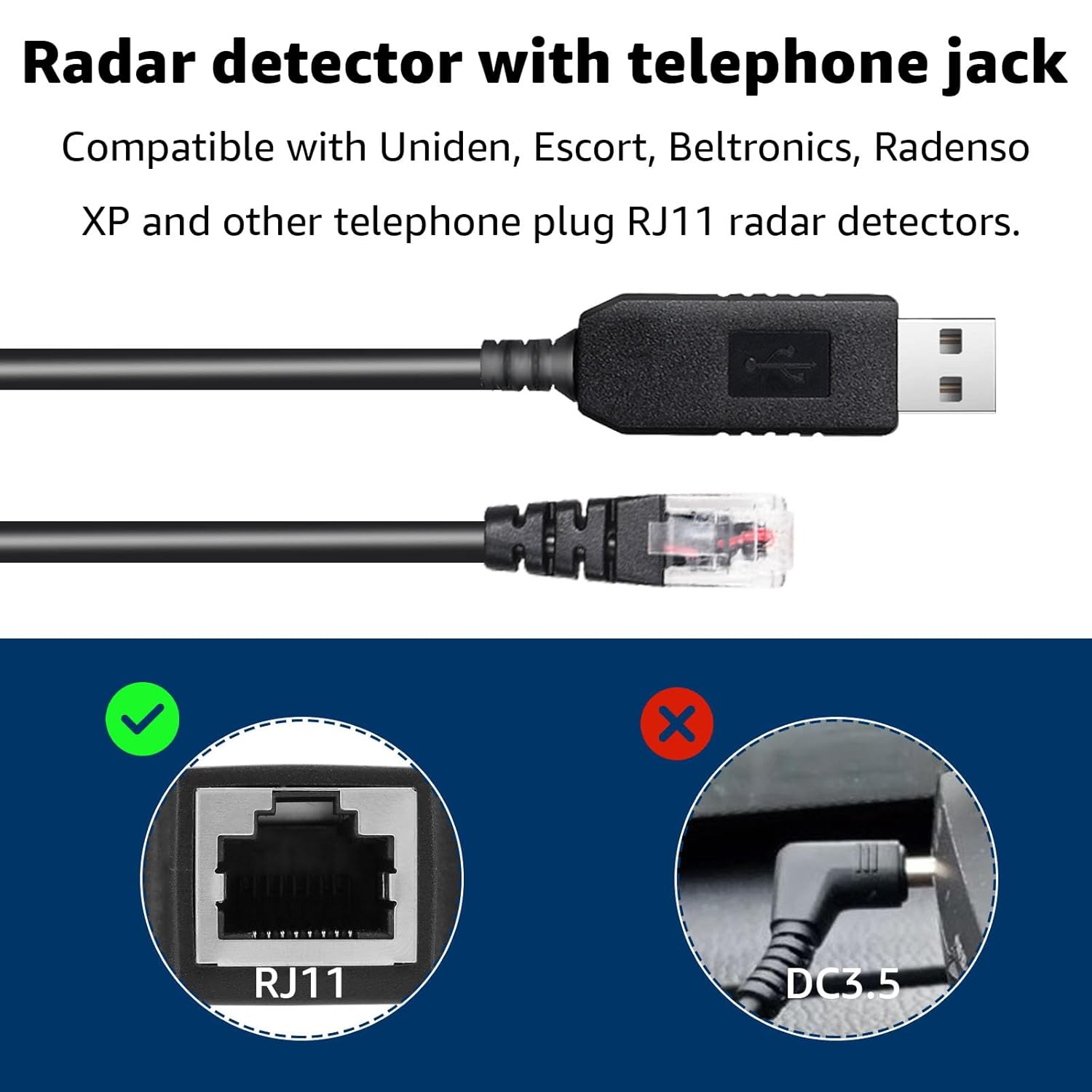 - Universal Compatibility:Perfect for powering a wide range of radar detectors with phone type jacks (RJ11), our cable is compatible with Uniden, Escort, Beltronics, Radenso XP etc and other Telephone Plug RJ11 radar detectors. Experience hassle-free connectivity, no matter your radar detector model;