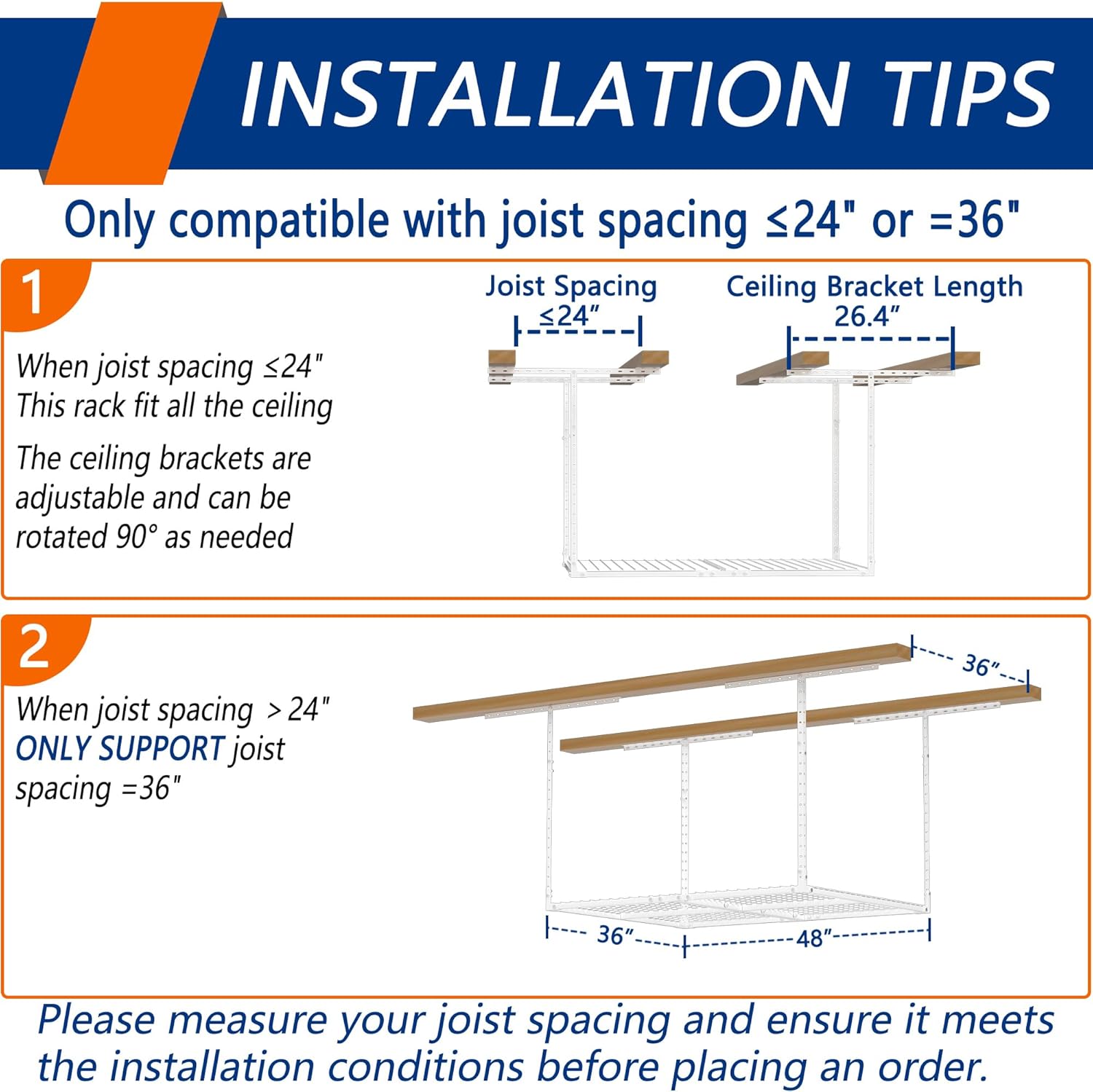 - ADJUSTABLE HEIGHT: Our garage storage racks are height adjustable,giving you the freedom to adjust the distance between the rack and the ceiling from 22 inches to 42 inches. This 3FT x 4FT ceiling mount rack adds up to 40 cubic feet of storage space.