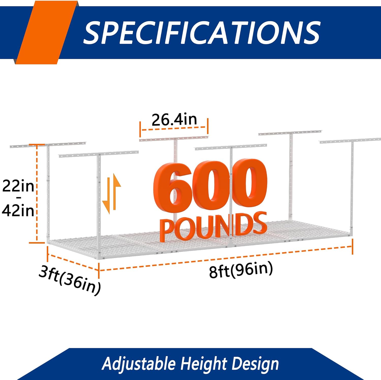 - ADJUSTABLE HEIGHT: Our garage storage racks are height adjustable,giving you the freedom to adjust the distance between the rack and the ceiling from 22 inches to 42 inches. This 3 FT x 8 FT ceiling mount rack adds up to 82 cubic feet of storage space.