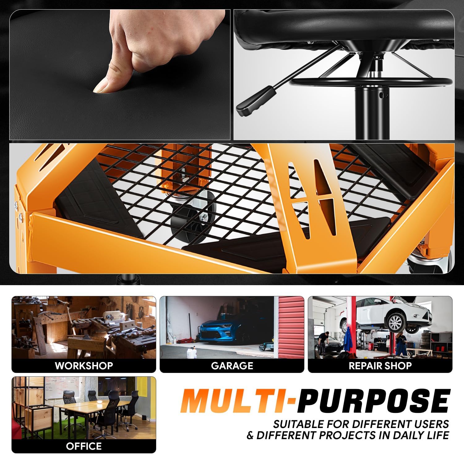 - Sturdy Construction - Stamped Steel Construction Frame With Yellow Painted Finish For Added Durability and Great Looks. This Mechanic Stool can Bearing 330 Pounds, Almost Anyone can Take a Seat.