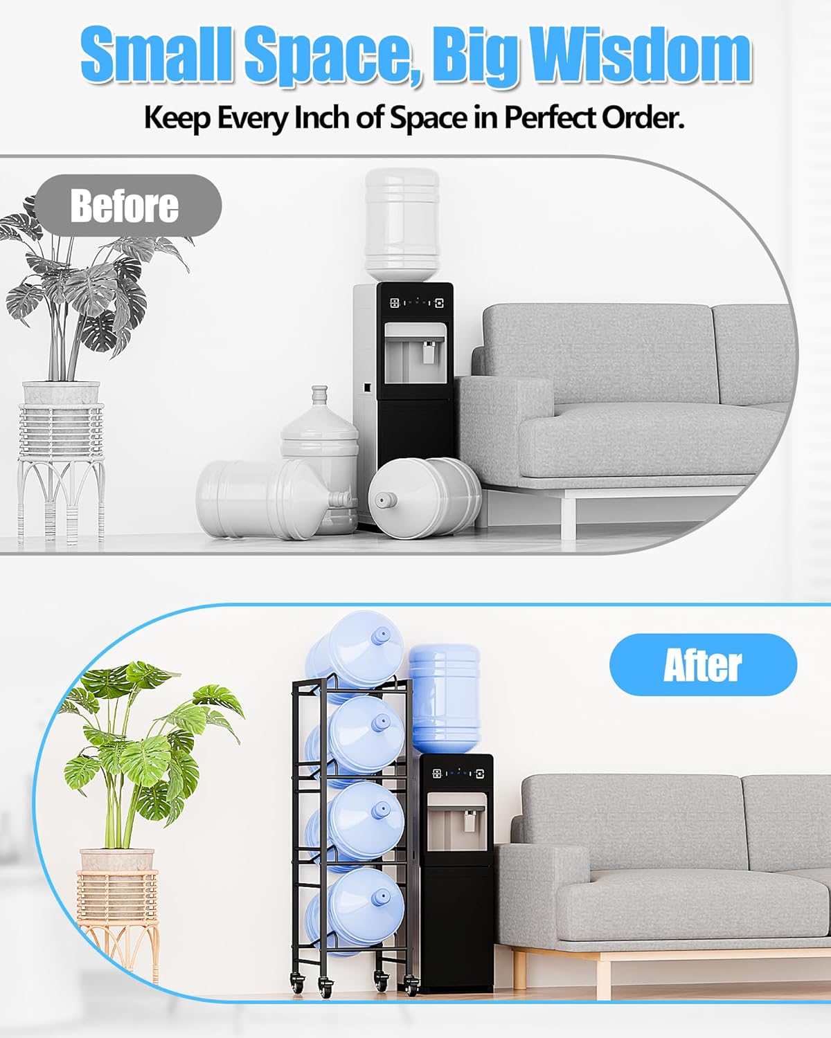 - Space saving: Our water jug rack adopts vertical space design cleverly, making the 5 gal water jug not take up too much of the ground. You can stack four 5 gallon jugs neatly at once, keeping your space neat and organized and saving a lot of space.