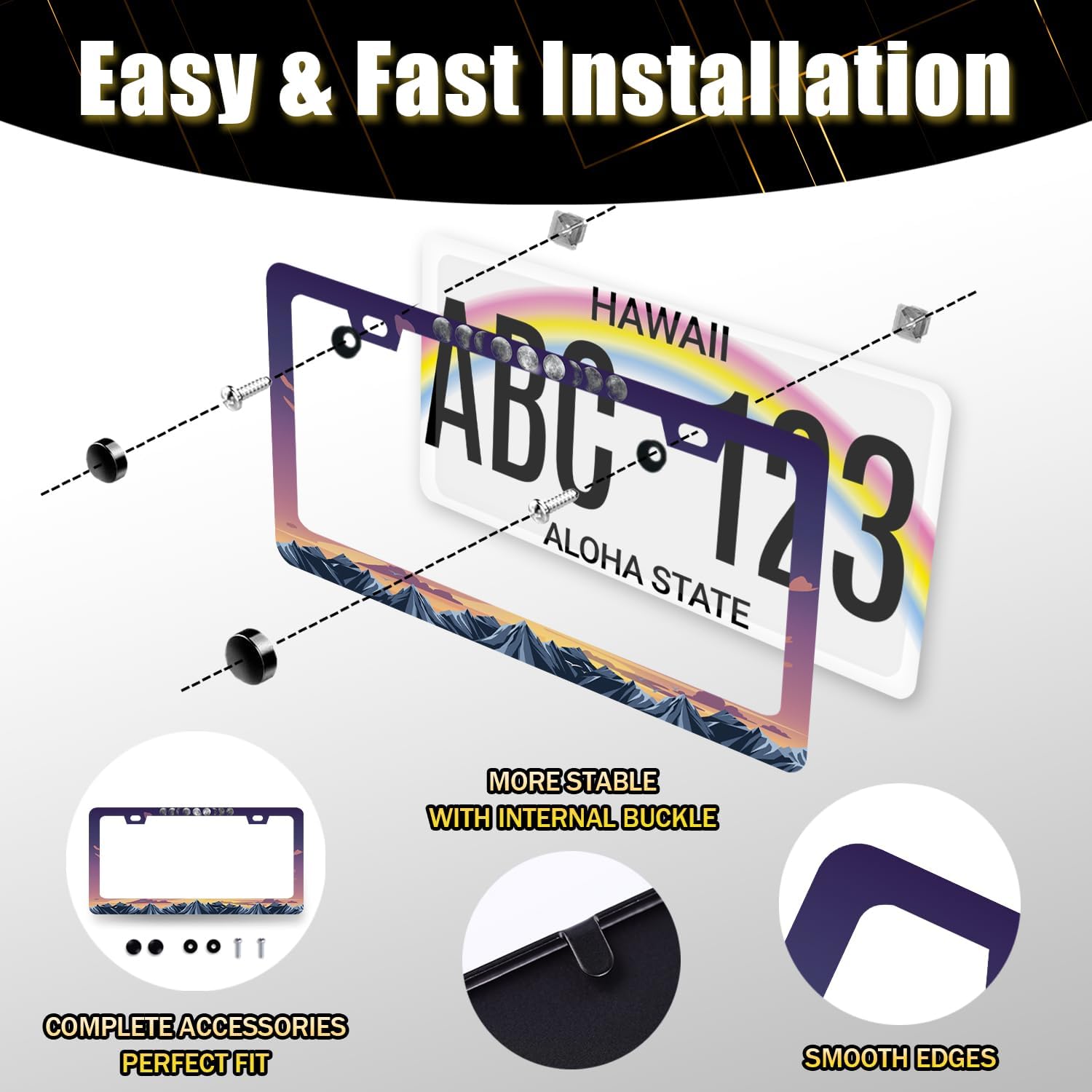 Moon Phase License Plate Frame Mountain Night Stars License Plate Holder Front and Rear Car Tags Stainless Steel Auto Parts Funny License Plate Decoration with Screws Men Women 12.2"x 6.2"