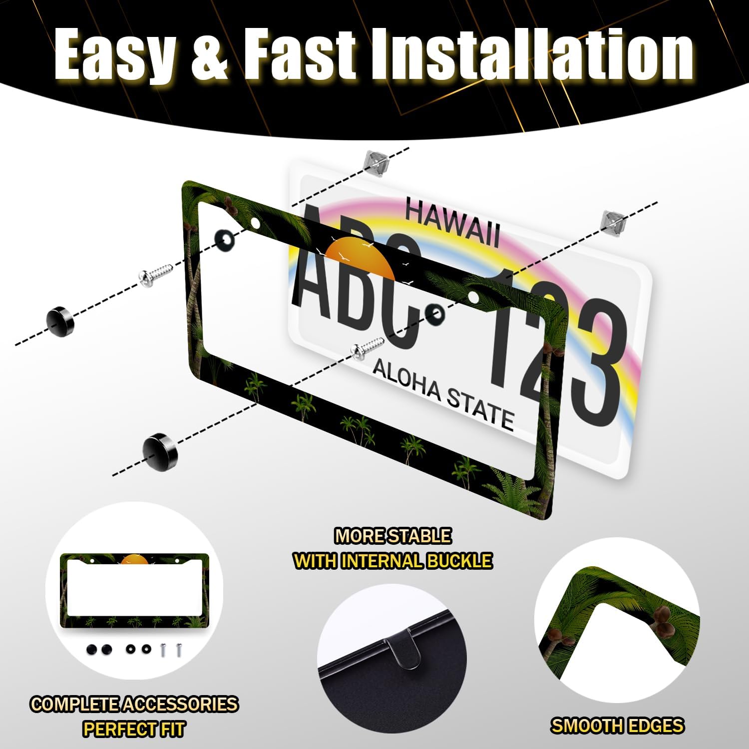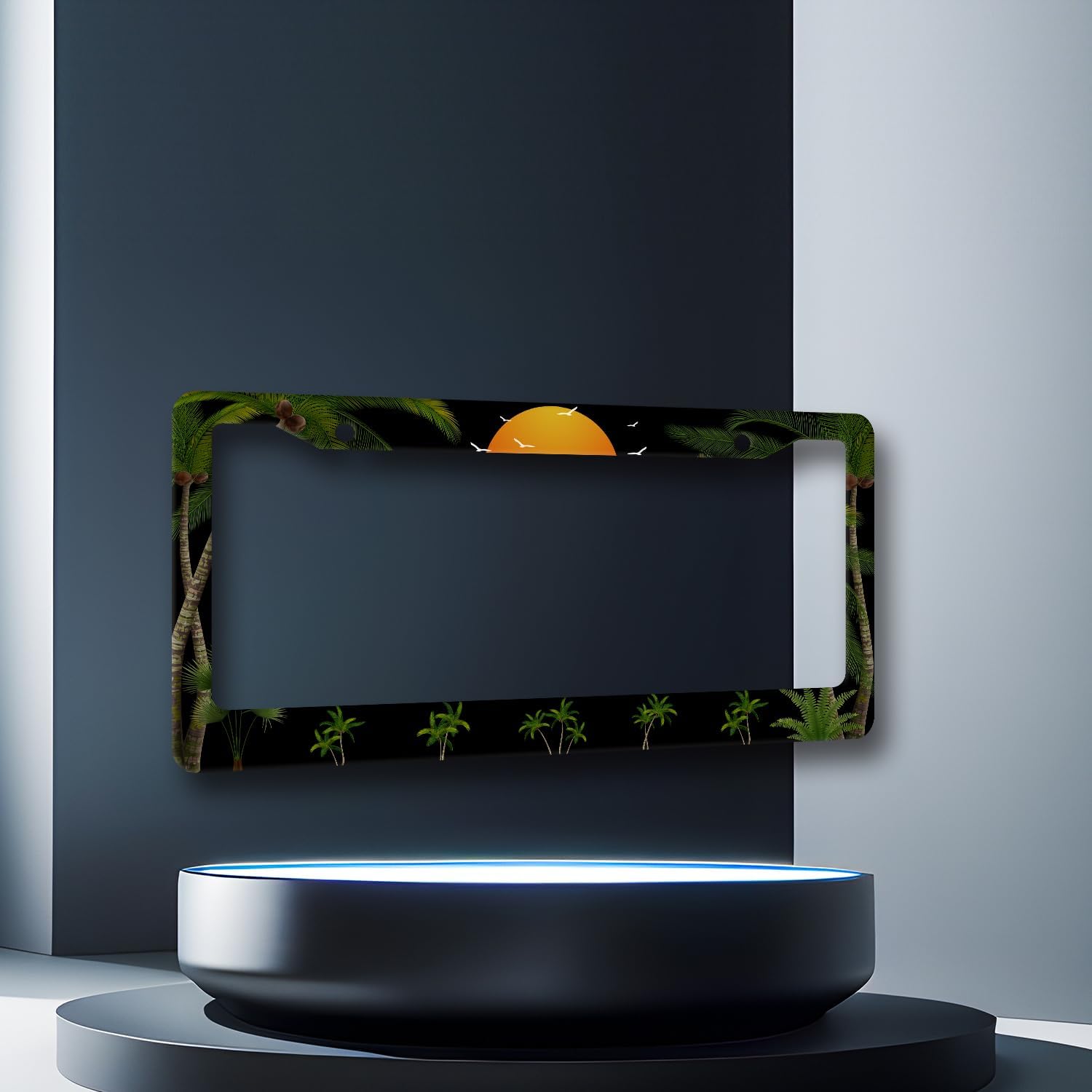 Palm Trees Sunset License Plate Frame Tropical Plants License Plate Holder Stainless Steel Front and Rear Car Tags Auto Parts Colorful License Plate Men Women Decoration with Screws 12.2" x6.2"