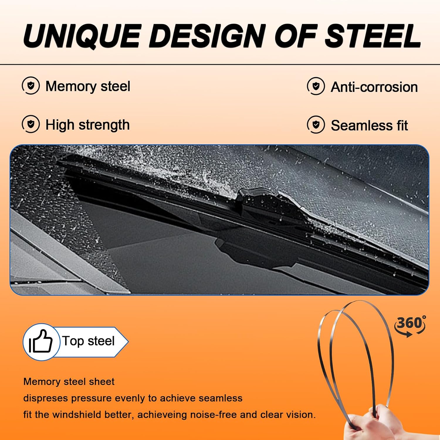 - 𝐑𝐄𝐋𝐈𝐀𝐁𝐋𝐄 𝐒𝐄𝐂𝐔𝐑𝐈𝐓𝐘: Upgraded windshield wipers have a specific beam curvature, ensuring a perfect fit without noisy. Silicone wiper blades utilize dual precision-tuned steel springs to apply uniform pressure along the entire blade length, providing clear visibility in all weather conditions