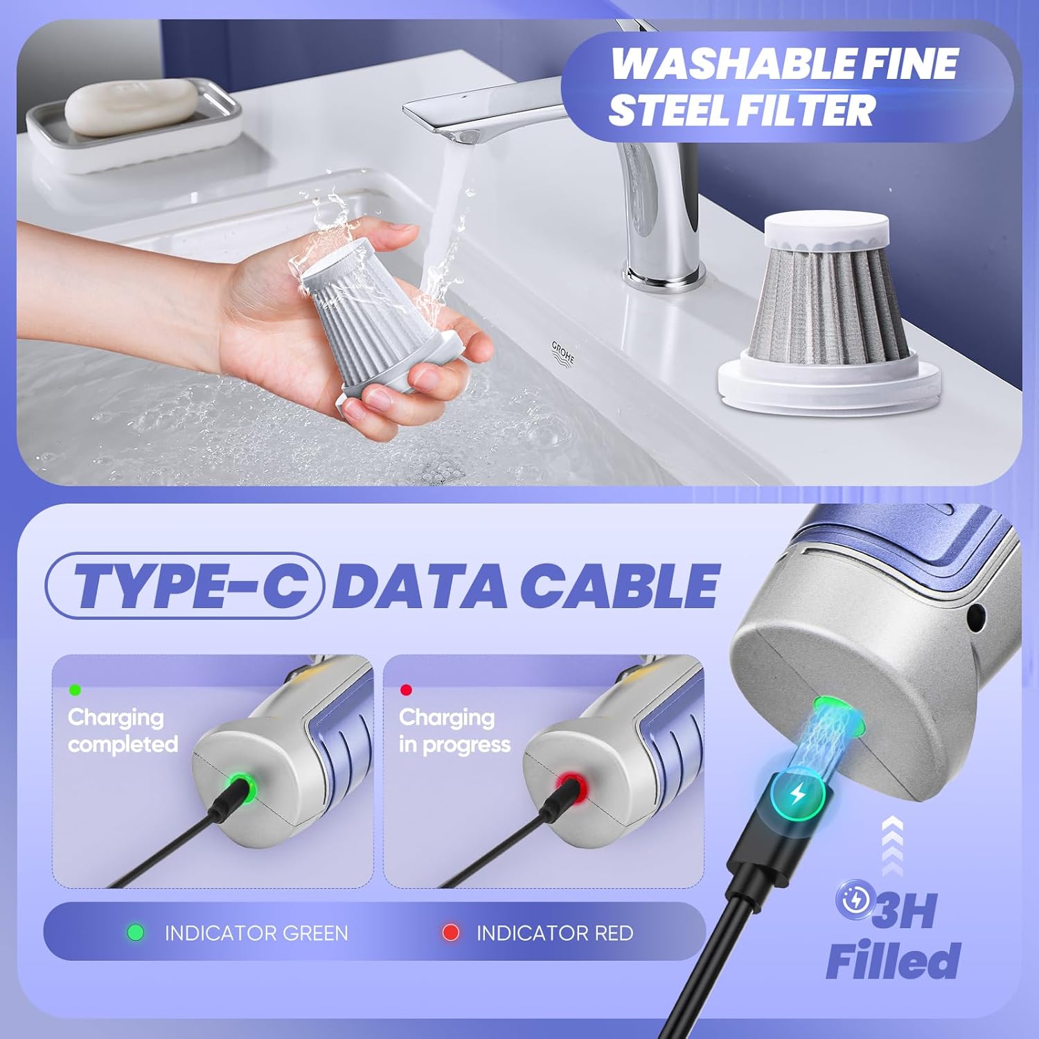 - 【HEPA Filter】 The handheld vacuum cleaner is equipped with two different filters. The HEPA filter can be washed and can be used for 2-3 months. The upgraded fine steel filter can be used again with a simple wash, and the service life can be more than 1 year.